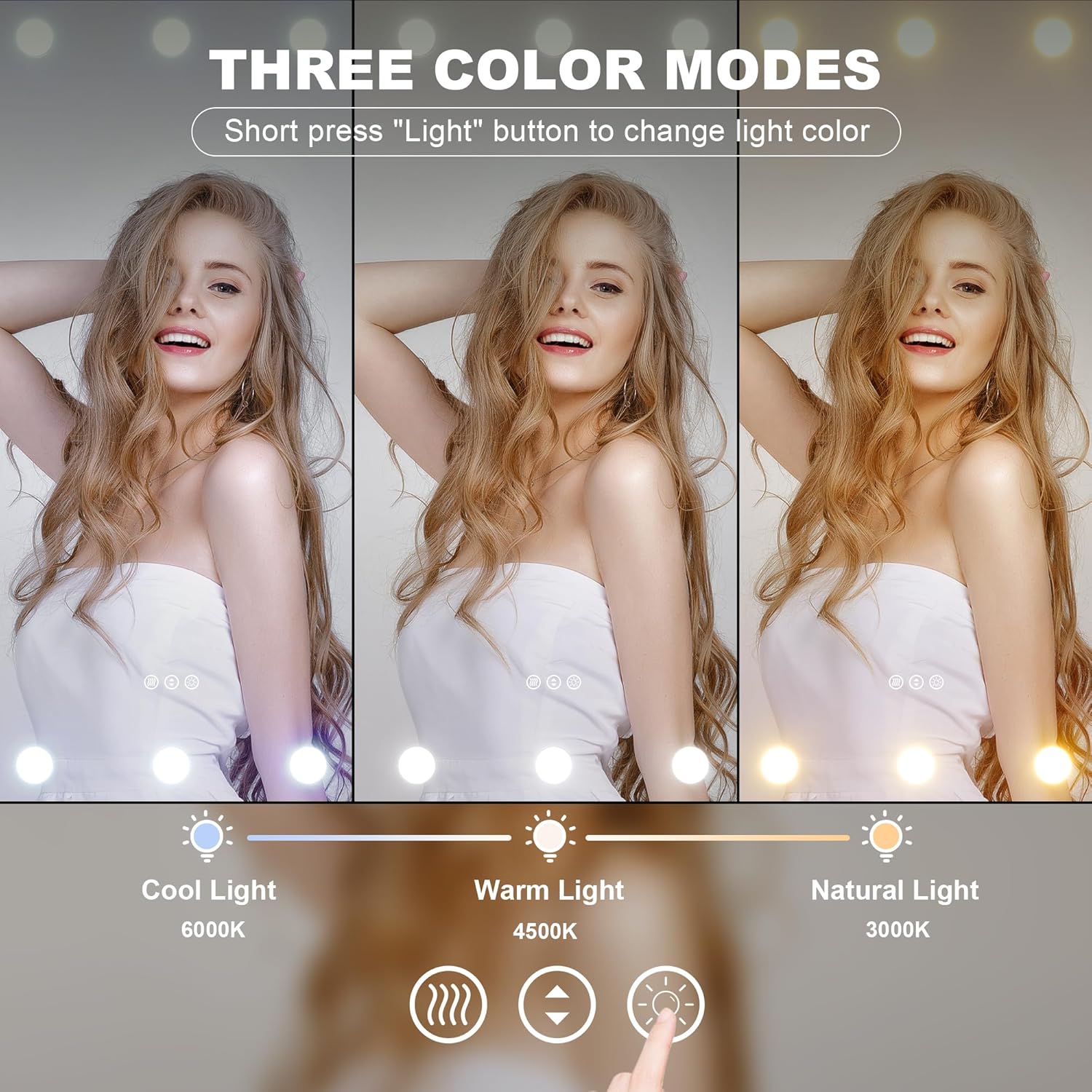 - 【3CCT and Brightness Adjustment】 This LED bathroom mirror offers 3000K (warm light), 4500K (natural light), and 6000K (cool light). Short press the button to switch modes, and long press to adjust brightness. The memory function saves your last settings, eliminating the need for readjustment.