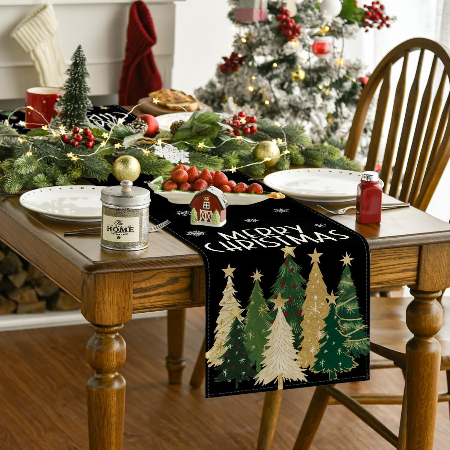 Artoid Mode Xmas Trees Snowflakes Black Merry Christmas Table Runner, Winter Seasonal Kitchen Dining Table Decoration for Home Party Decor 13x48 Inch
