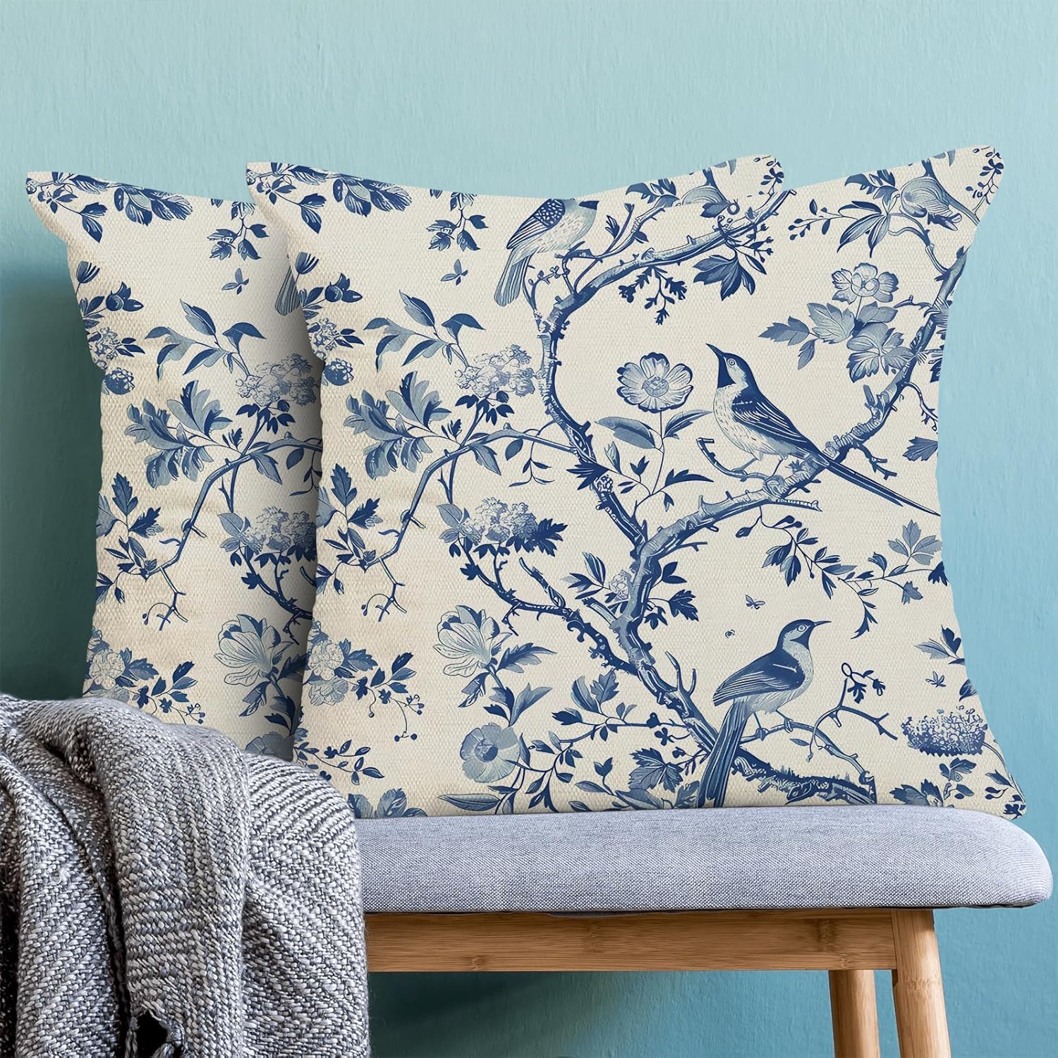CXMEIFLY Spring Floral Pillow Covers 18 x 18 Inch Set of 2 for Navy Blue Chinoiserie Flowers Bird Decor Throw Pillows Vintage Plant Outdoor Decorative Cushion Cases for Couch Bed Decorations