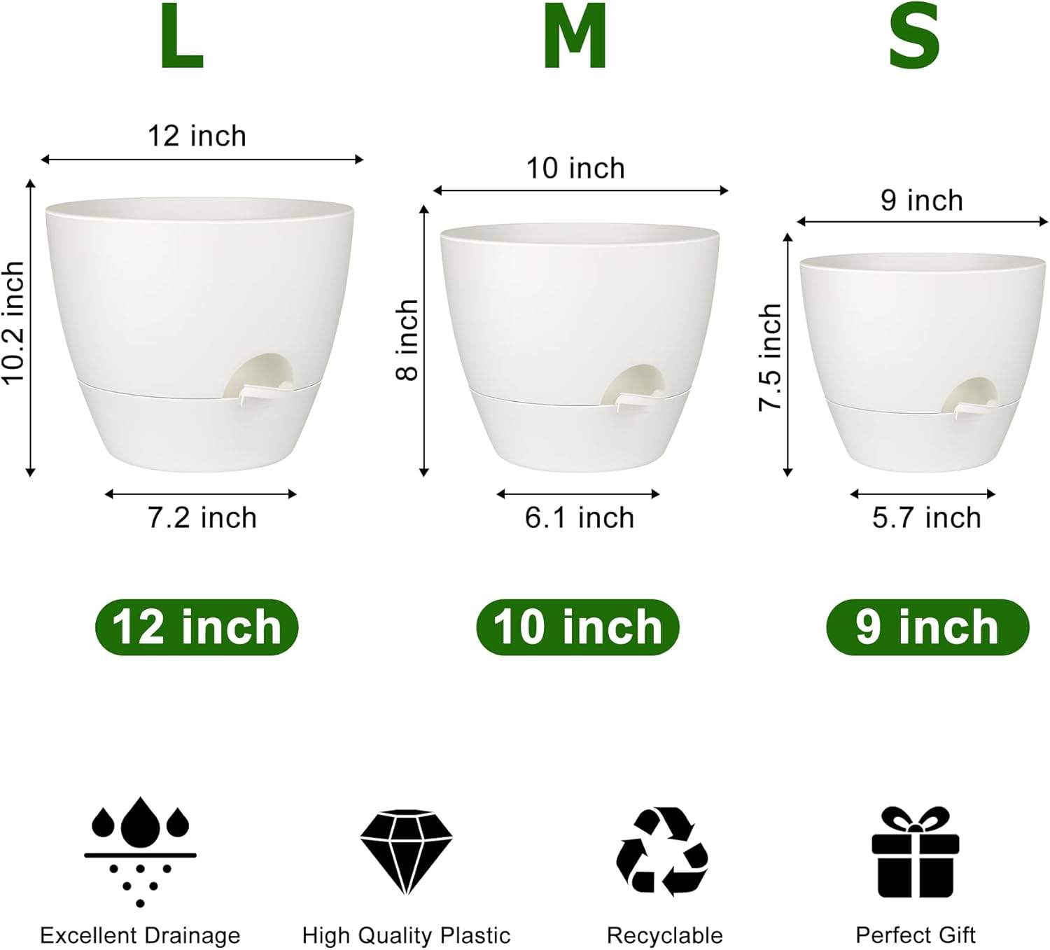 Plant Pots 12/10/9 Inch Self Watering Pots, Set of 3 Plastic Planters with Drainage Holes and Saucers,Plastic Flower Pots,Nursery Planting Pot for Indoor Out Door Plants(Pure White)
