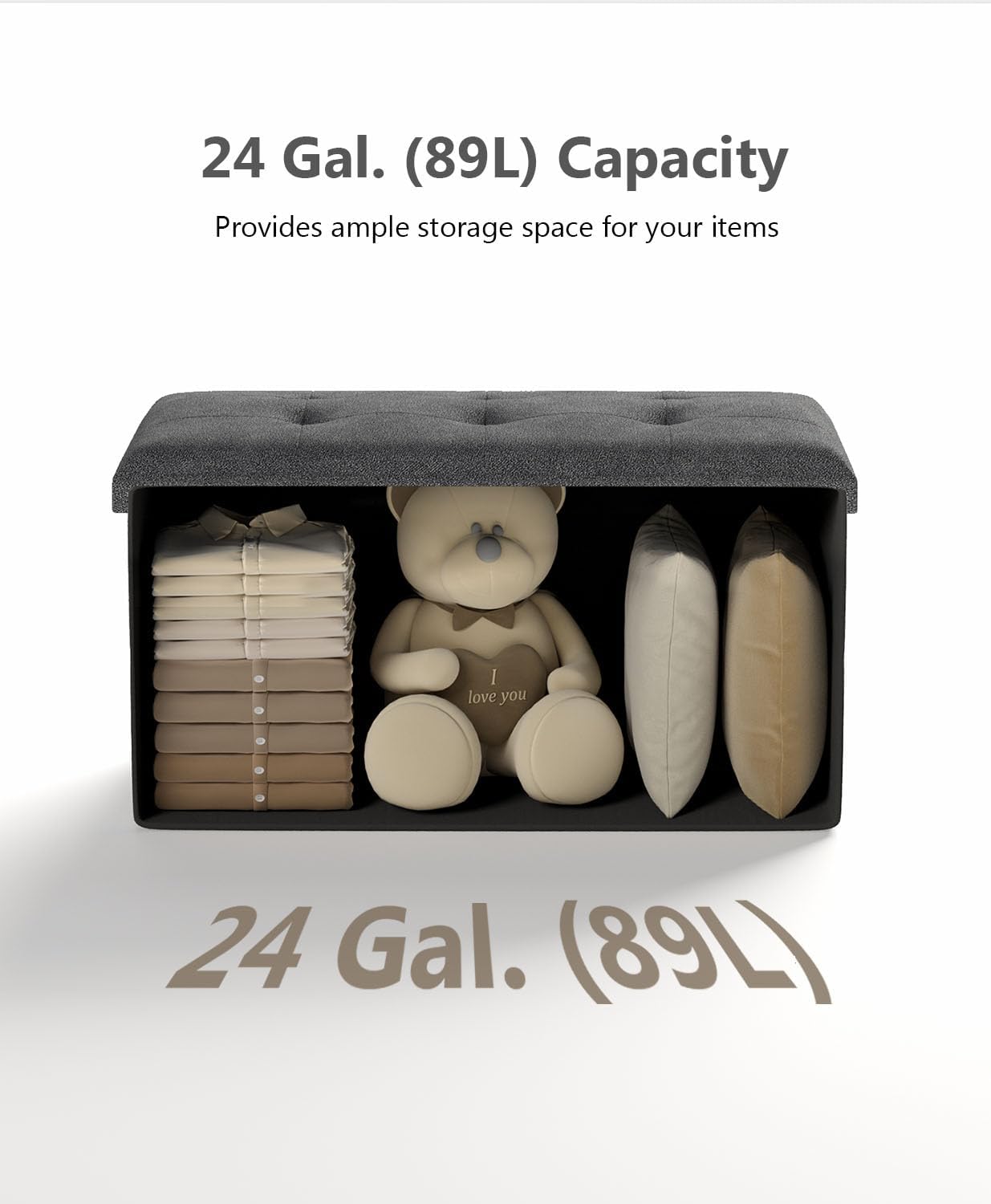 - [Plenty of Storage Space] This folding ottoman, sized 15”D x 30"W x 15”H (38 x 76 x 38 cm) with a total capacity of 24 gallons, can be used to neatly organize your bed sheets, pillows, blankets, magazines, and more