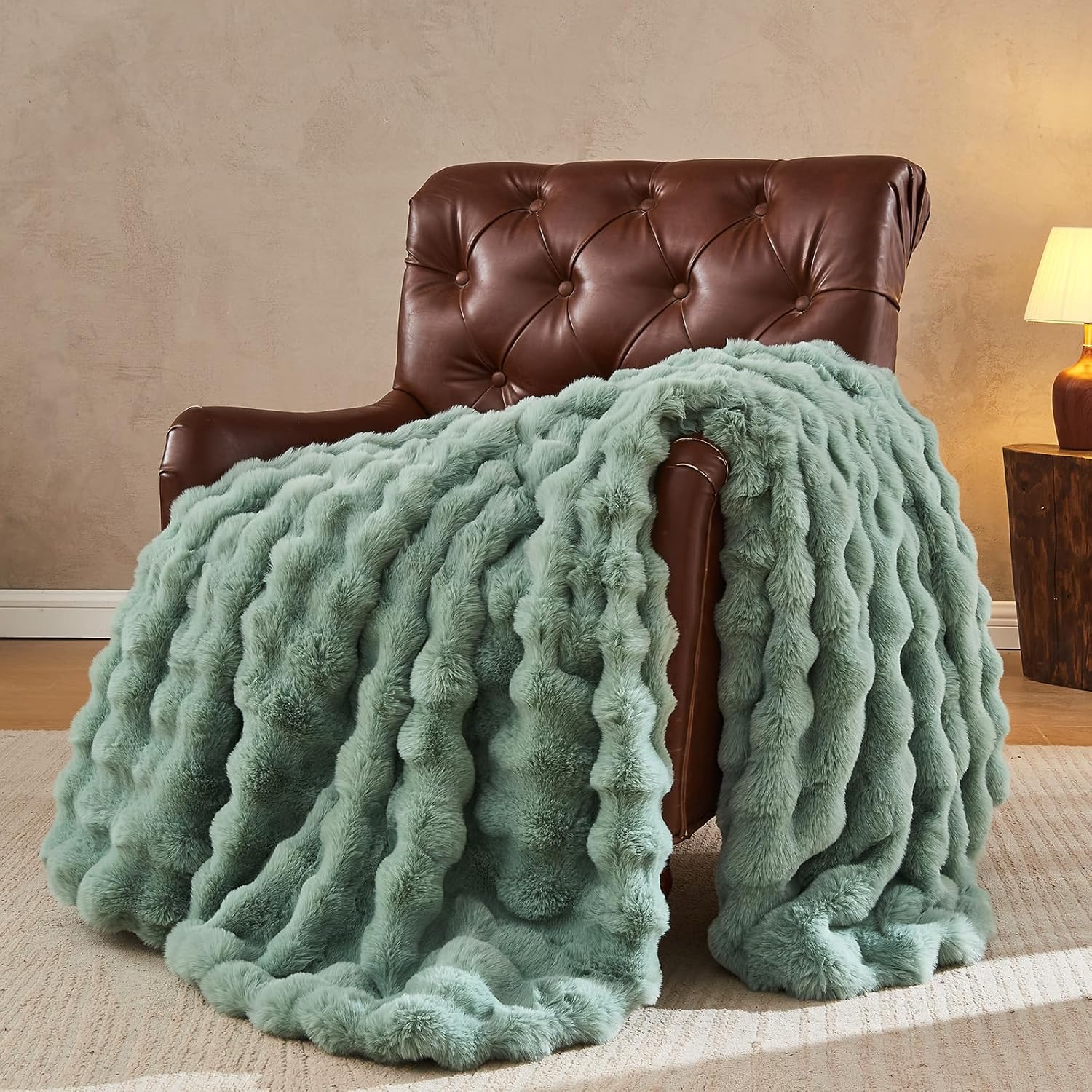 Lotus Karen Faux Fur Throw Blanket Sage Green - Big Bubble Rabbit Fluff Blanket for Couch Bed Sofa,Softest Fluffy Fuzzy Cozy Blanket, Plush Thick Furry Shaggy Warm Blankets for Women,50x60 Inches