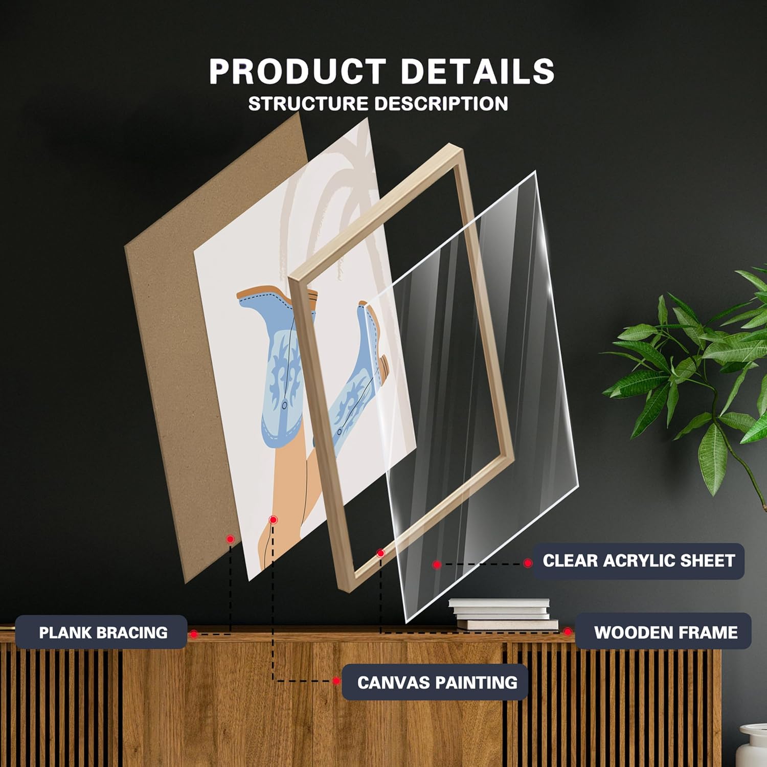 - Cowgirl Boots Wall Art: Each canvas print in this set is wood-framed,With a versatile size of 16x24 inches, perfectly in modern and rustic spaces. The wooden frames enhance the coastal charm while ensuring the prints are durable and ready to hang in your living room, office, or bathroom.