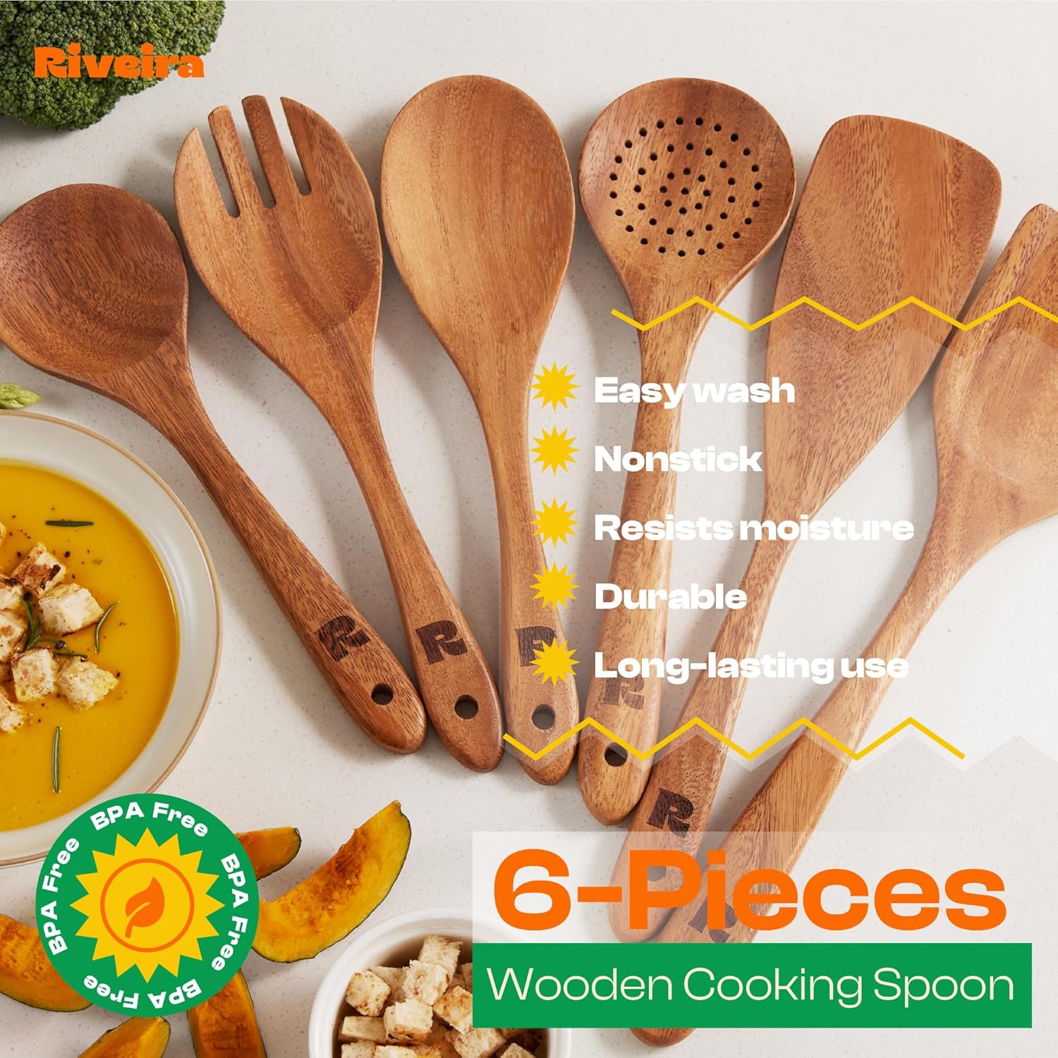 Riveira Walnut Wooden Spoons for Cooking Set of 6 – Natural Walnut Wooden Cooking Utensils, Wooden Spatula, Wooden Spoon - Premium Quality Wooden Utensil Set for Non-Toxic Cooking