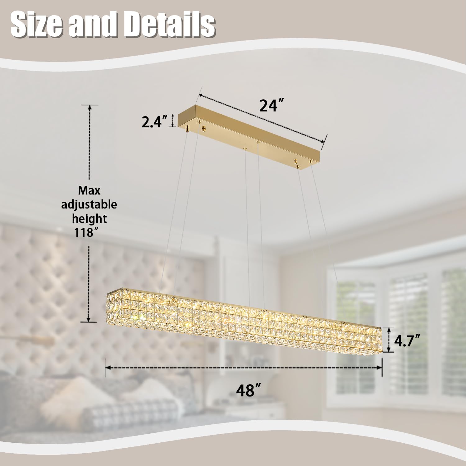W48 Rectangular Gold Crystal Chandelier Modern Rectangle Pendant Ceiling Light Fixture for Living Room Dining Room Kitchen Island Bar