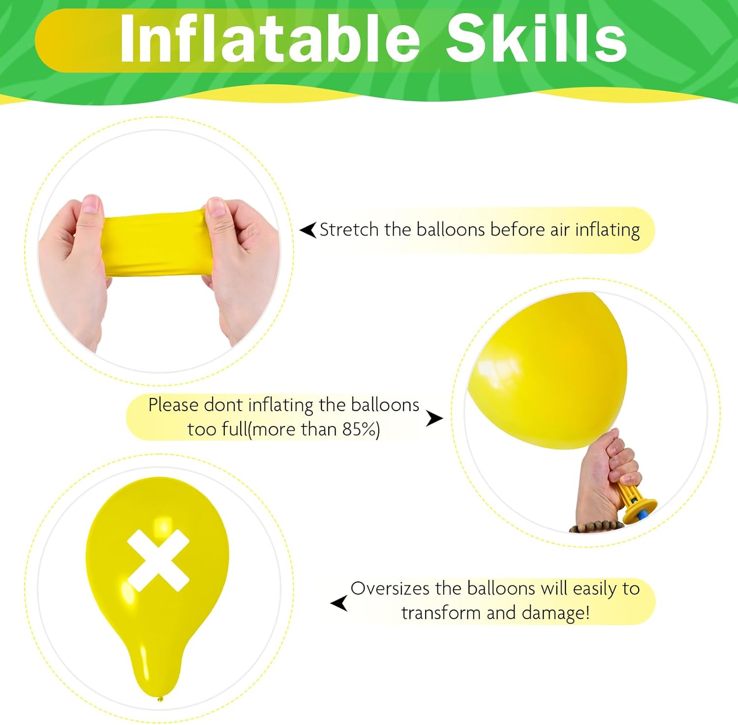 - Warm Tips: Please avoid exposing birthday balloons to direct sunlight before use to avoid affecting the quality and life of the balloons bulk; During the inflation process: Please inflate the globos into a round shape to prevent the helium balloons from bursting; Choking Hazar: Adult supervision is required; Keep uninflated assorted balloons away from children