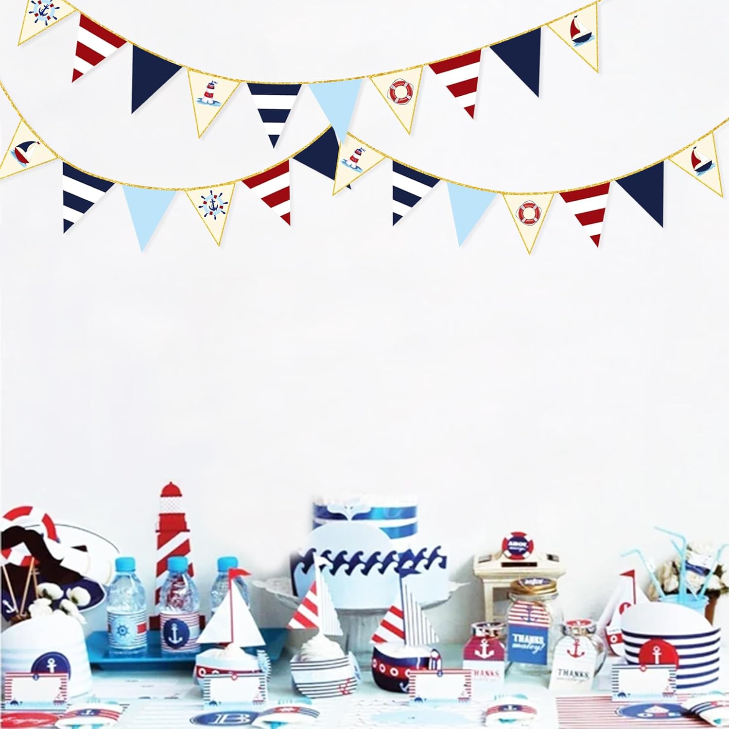 - 🔵Unique Design - Nautical theme color(navy blue,pale blue,red,beige) and nautical themed element printing with gold glitter stamping,Then machine-sewn together with gold glitter ribbon.This design will let your party decor more eye-catching and special.makes an attractive backdrop for videos and photos.