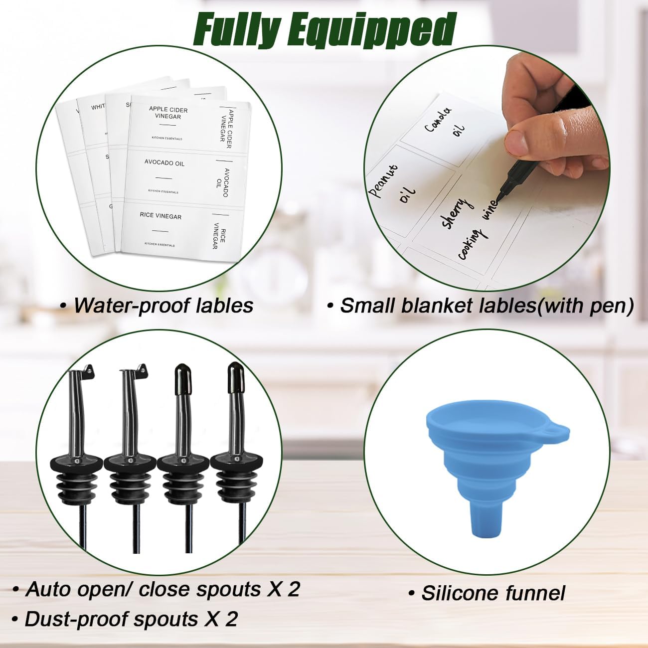 - Olive Oil Dispenser Bottle Set :This oil dispenser set includes two 17 oz / 500ml glass olive oil dispenser bottles, 2 types of stainless steel drip-free pourers and a funnel for easy refills, a labeling pen, and 12 printed labels and 18 blank labels. Use them as small oil dispensers, vegetable oil dispensers. The book shape oil dispenser design is ideal as a syrup bottle, soy sauce dispenser, or olive oil bottle dispenser. This versatile oil holder for kitchen sets meets all your kitchen needs.