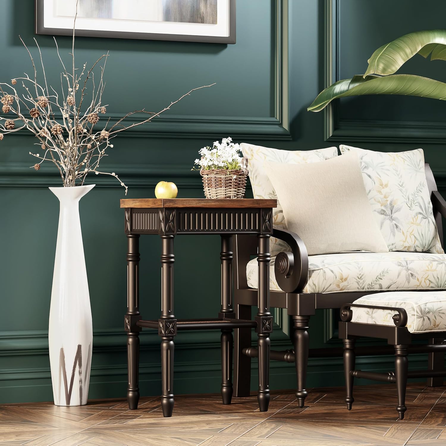 Rustic Farmhouse Cottagecore Accent End Table Set of 2, Distressed Accent Side Table with Espresso Tray Top and Woven Wicker Shelf, Boho, French Country Decor, Square, Weathered Brown & Black