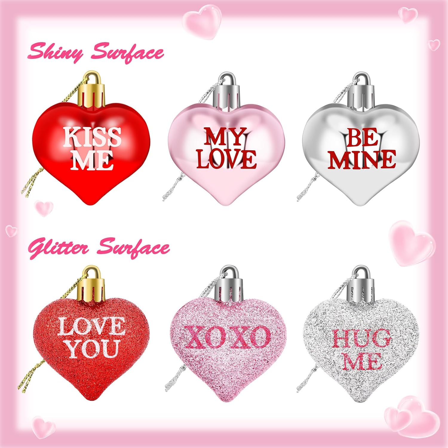 - Valentine's Day Heart-Shaped Ornaments: Package includes 24 pieces 3D Valentine's Day heart shaped ornaments in red, pink, rose gold and silver. The size of each Valentine's Day ornaments is 1.77x1.77 inches. As an ideal decoration for outdoor and indoor parties, Valentines heart decorations add sweet and romantic color to your life