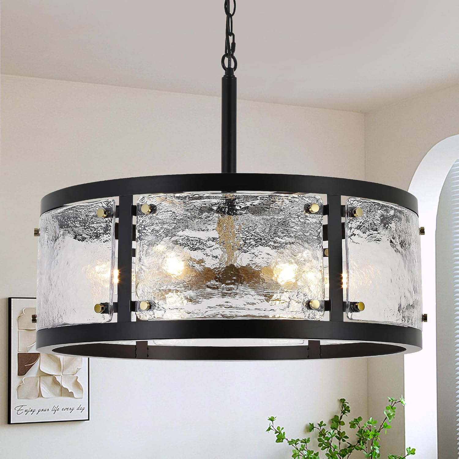 23.6" Large Farmhouse Drum Black Chandelier, 6-Light Vintage Round Glass Chandeliers for Dining Room, Industrial Light Fixture for Kitchen Living Room Stairwell, Clear Waterglass Drum Shade