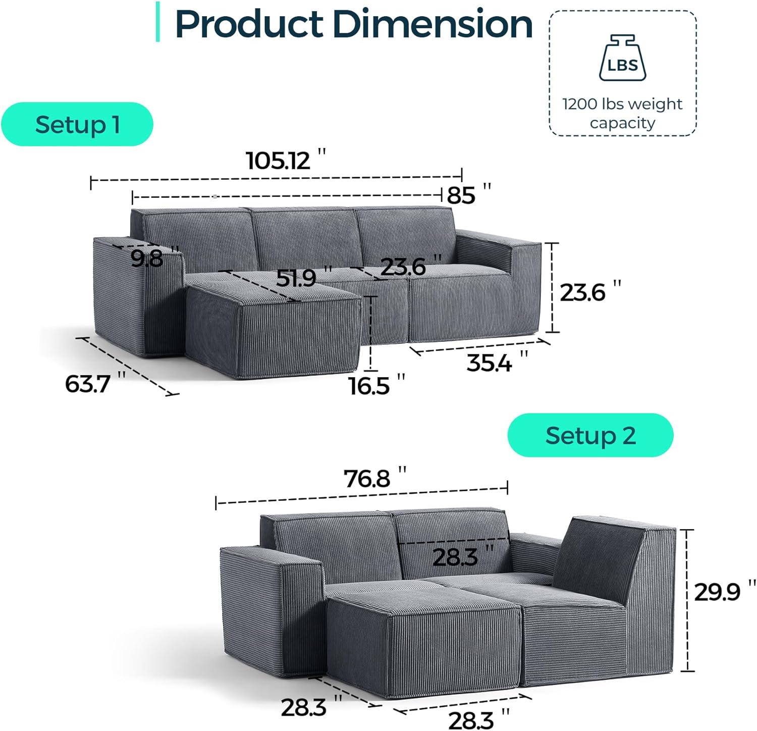 - Luxurious, Wrinkle-Resistant Corduroy: Wrapped in premium, wrinkle-resistant corduroy, this modular sectional couch combines soft, luxurious comfort with durability. The fabric feels smooth to the touch and resists wear, keeping your sofa looking and feeling fresh over time