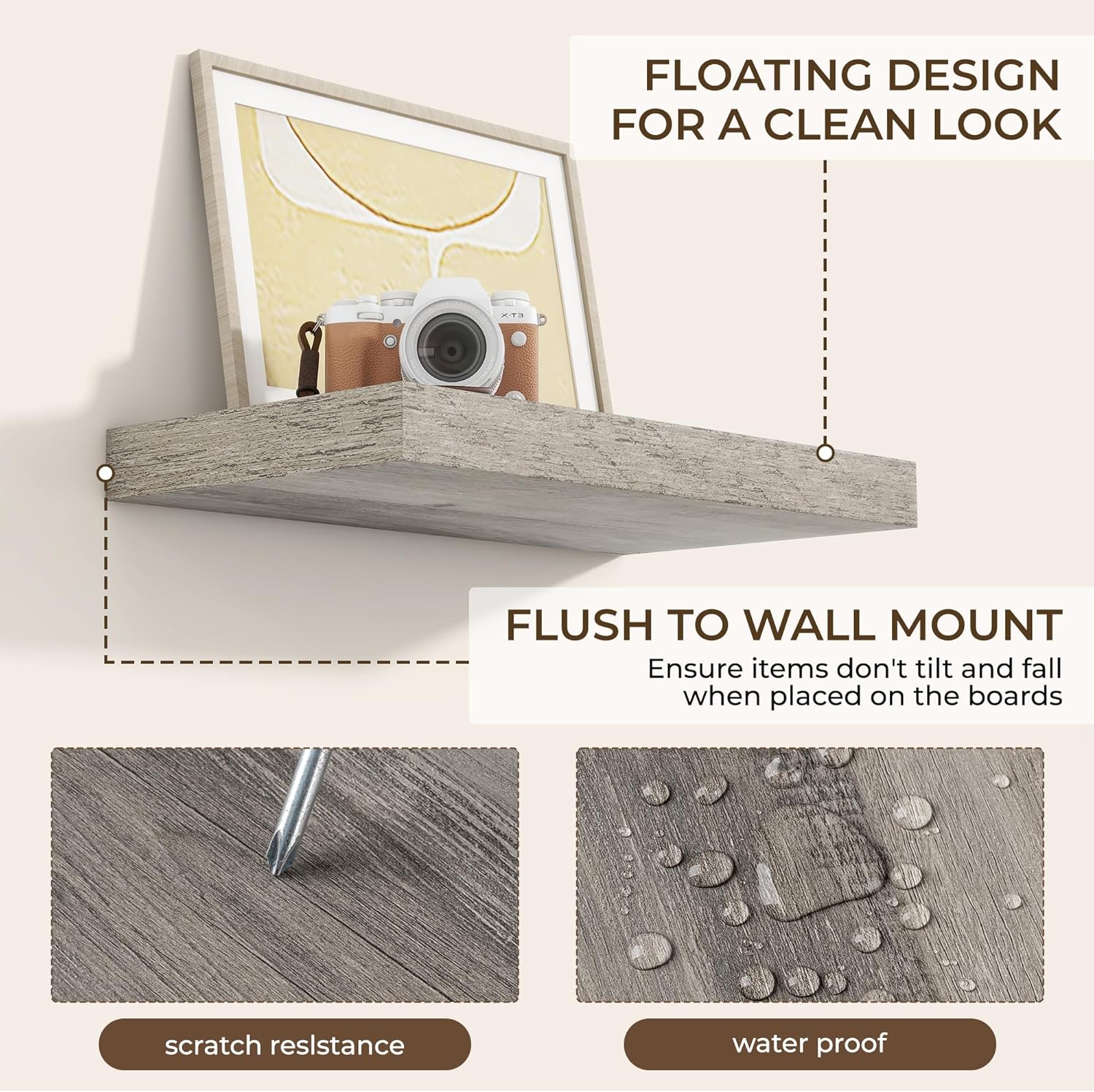 - Rustic & Modern Floating Shelves: These shelves for room wall are made of premium engineered wood board with PVC wood grain finish. The rustic wooden grain surface add character and warmth to any modern or traditional interior with these thick floating shelves. Having this floating shelves for room wall is not only for its decoration effect, but also for this wall shelves high practicality
