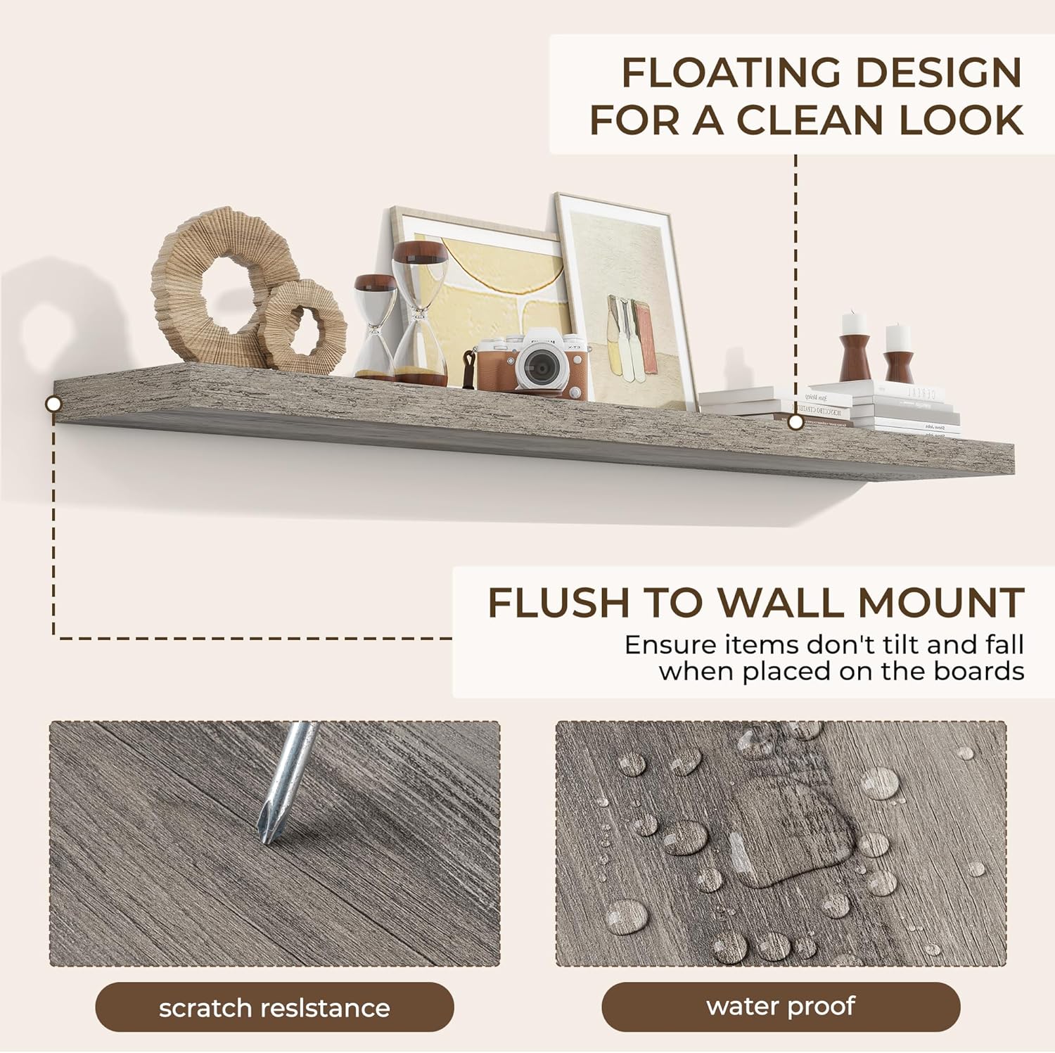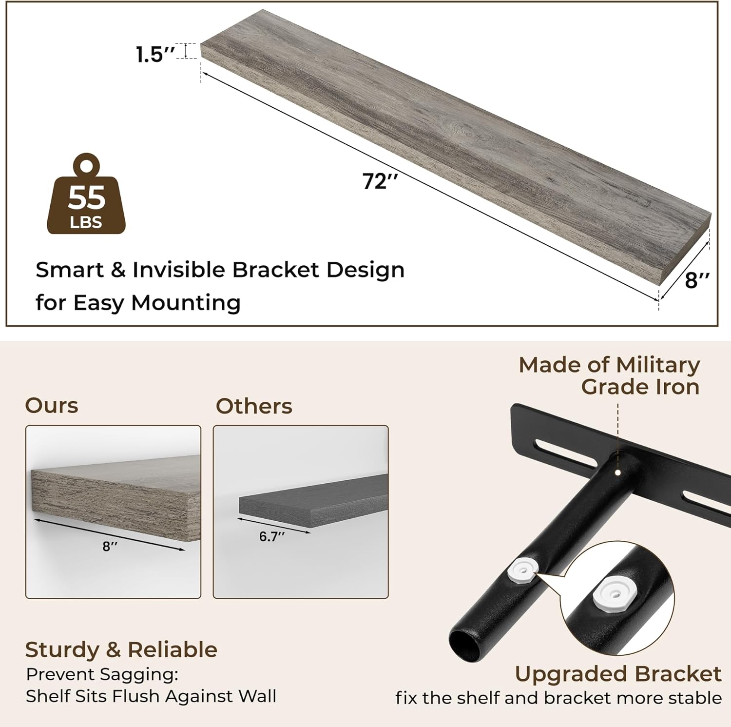 RICHFOCUS 72Inch Floating Shelves for Wall 2 Pack Shelves for Bedroom|Kitchen|Bathroom Wall Mounted Rustic Wood Floating Shelf with Invisible Brackets for Books|Storage|Decor, Grey