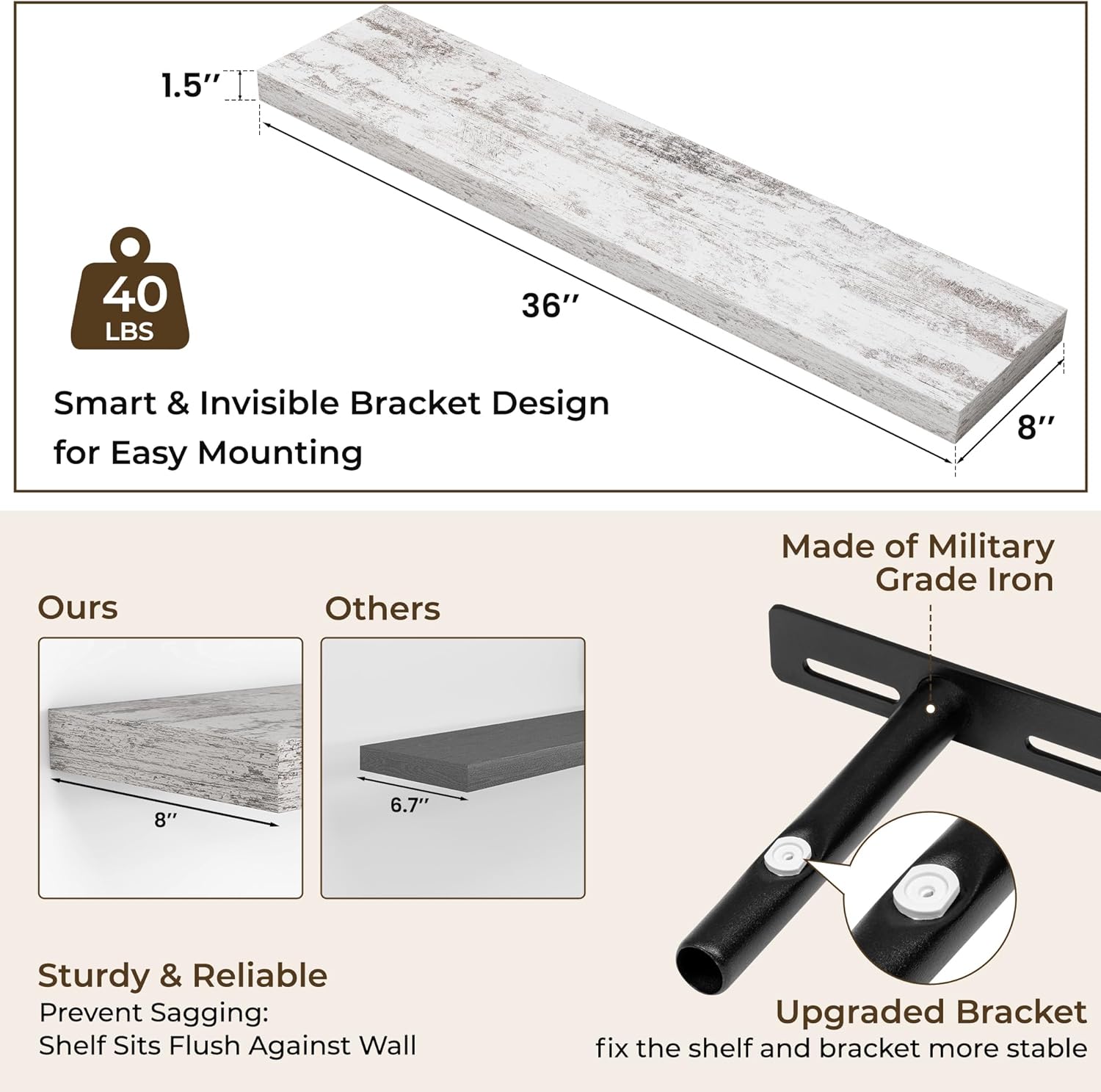 - 36 Inch Floating Shelves for Wall (Set of 2): Each wall shelves are 8 inches in depth and 1.5 inches in thickness. 2-piece set is more cost-effective and practical. Our wall shelf can be used in combination, staggered high or low on the wall, or mounted side-by-side to provide extra storage space for organizing small items and clutter in multiple areas such as kitchens, bathrooms, and bedrooms, creating a clean and smooth look. Multiple colors available