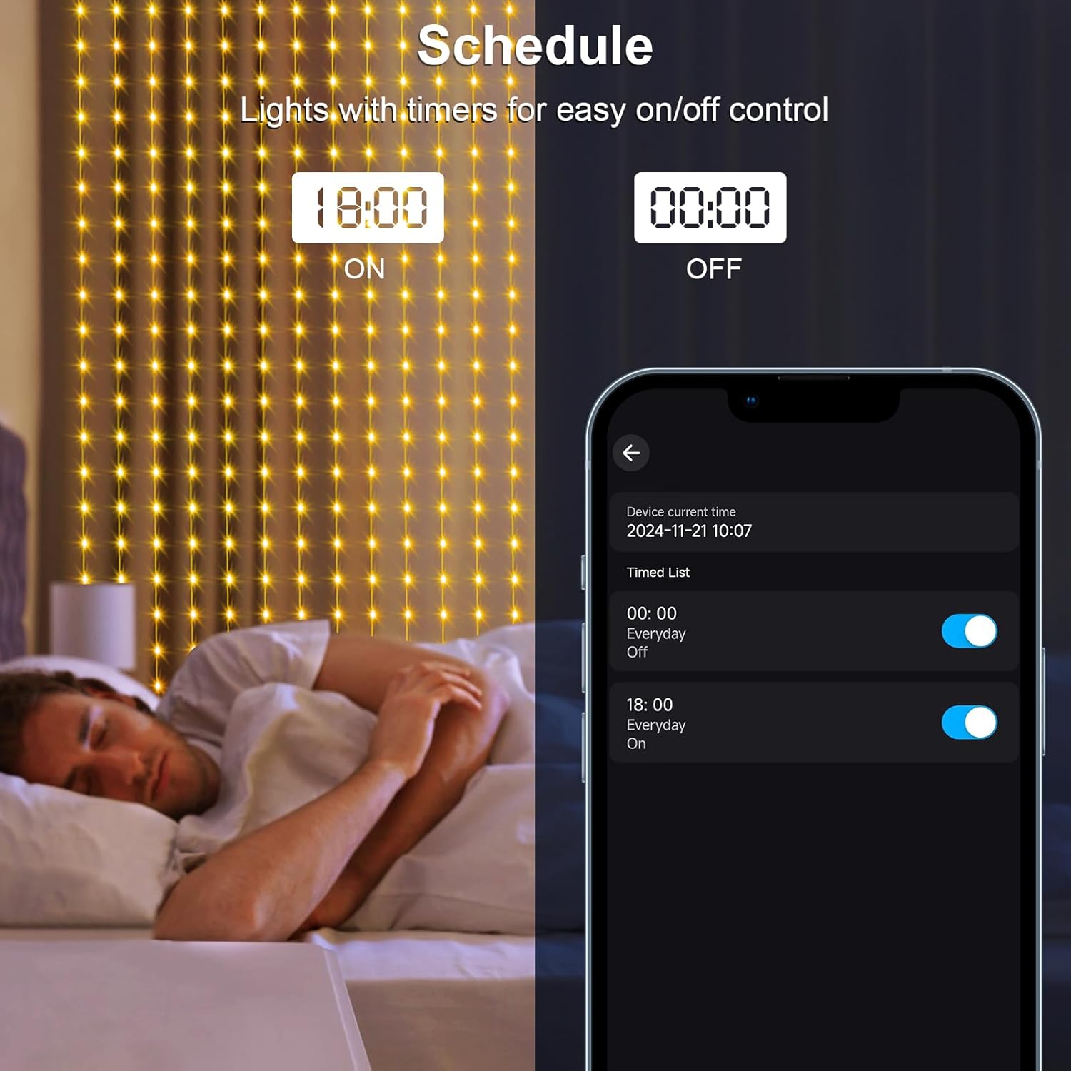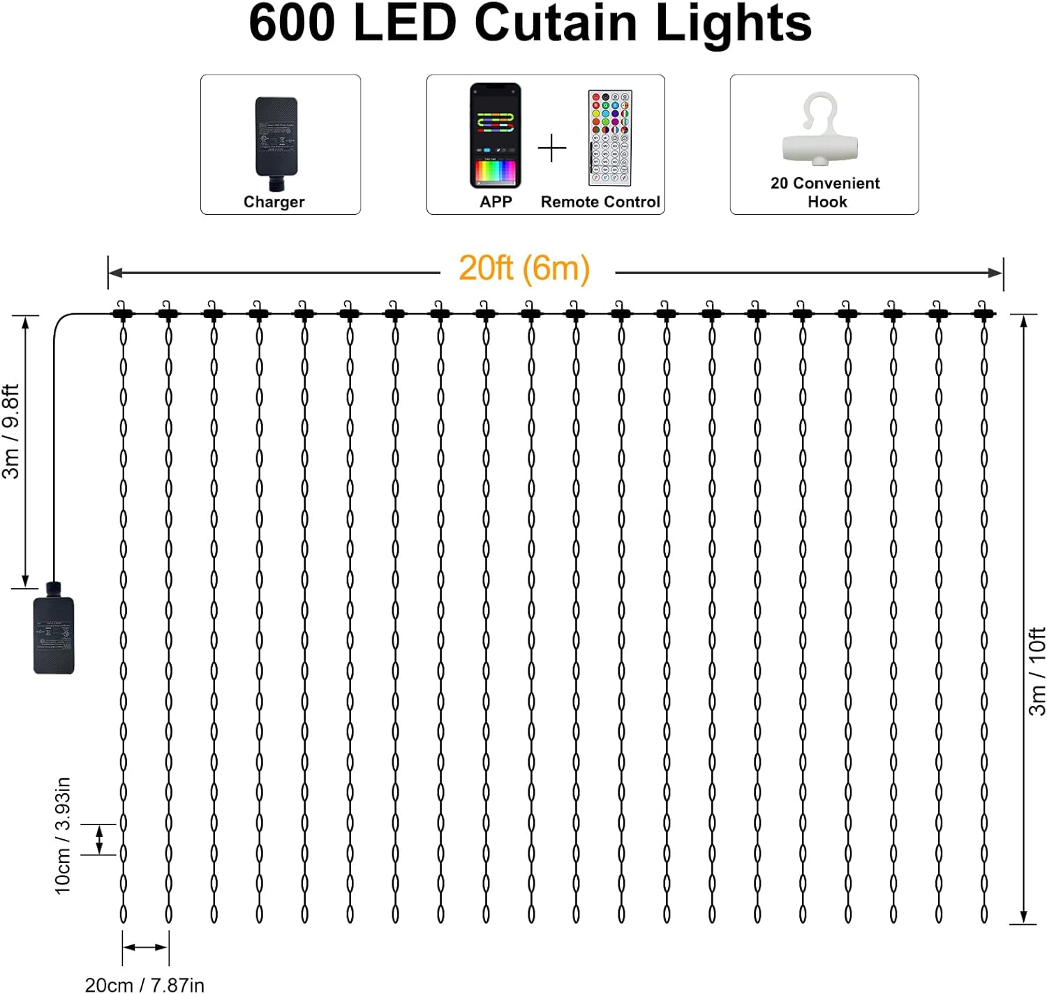 echosari Smart 600 LED Curtain Lights, 20Ft x 10Ft, Compatible with Alexa, App Control, DIY Fairy Lights, Dynamic for Backyard, Home, Wedding, Party Decor - RGB Color Changing IC