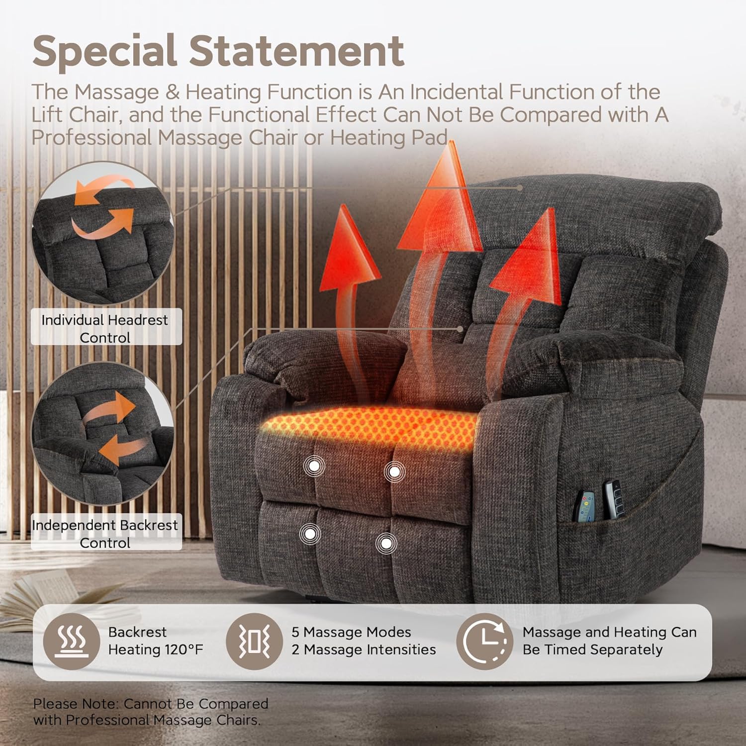 Lazy Boy Recliner Chair with Heated and Massage, 4 Motor Headrest, Lumbar Independent Adjustment Power Lift Recliner with Hidden Cup Holder、Side Pocket、Back Pillow