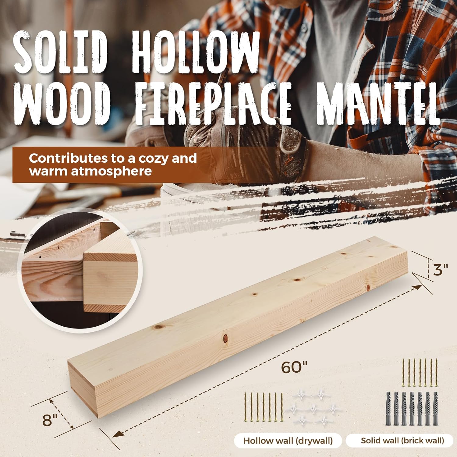 60x8x3 Fireplace Mantel - Handcrafted Hollow Rustic Solid Wood Wall Mounted Floating Shelf - DIY Color - with Invisible Heavy Duty Wood Bracket