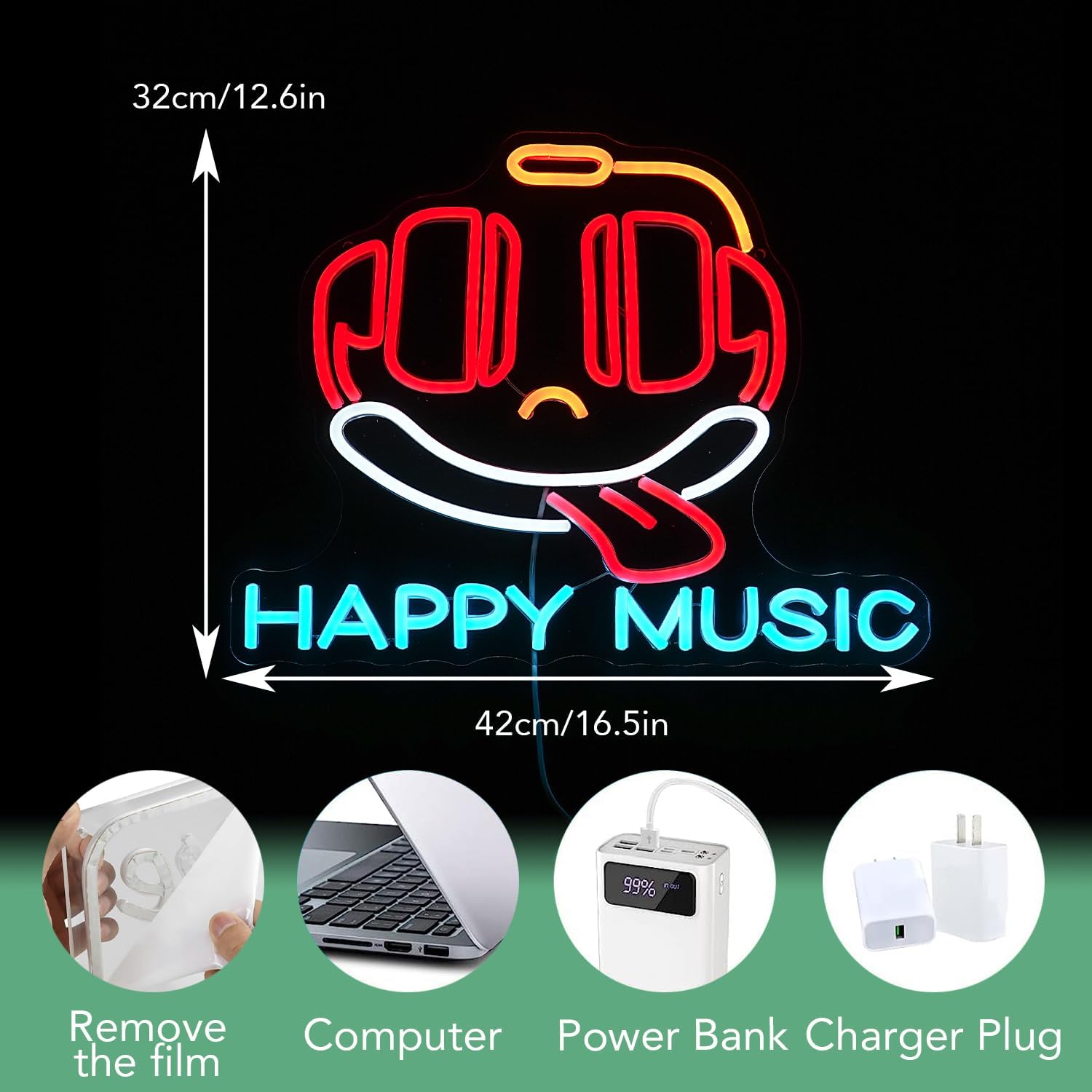 - Vivid wall decoration: Neon signs composed of cartoon characters wearing headphones and Happy Music slogans, exquisite and interesting, reflecting vitality and passion, can attract consumers' attention, widely used in music studios, bars, music venues, game rooms, parties, and bedroom decoration for teenagers