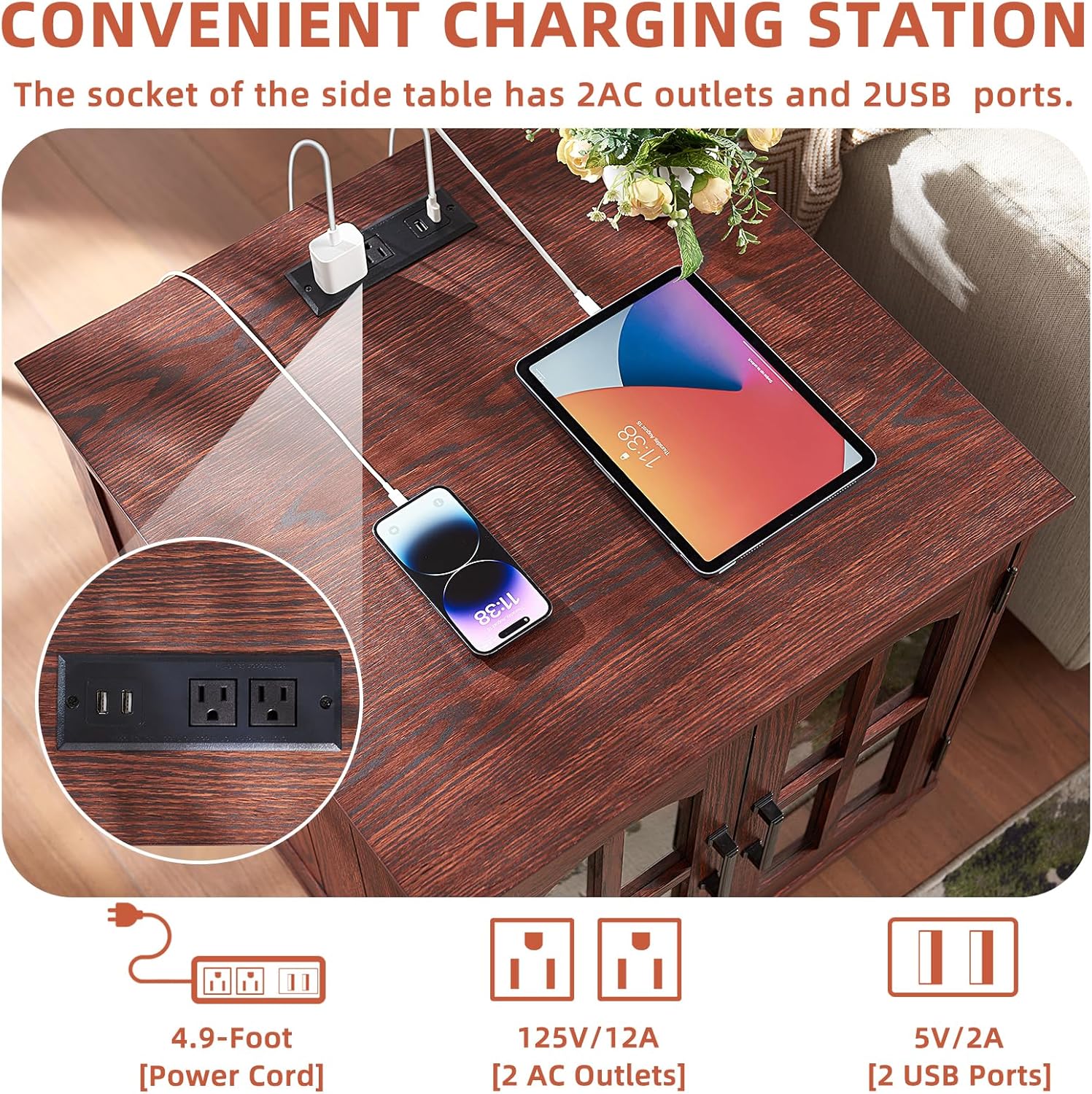 - 24'' large side table with charging station : This 24'' wood end table features a convenient charging station equipped with 2 power outlets and 2 USB ports. The spacious tabletop allows you to quickly charge multiple devices simultaneously, eliminating the clutter of tangled cables.