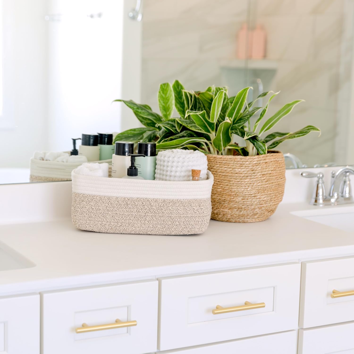 - Safe, Natural Cotton Organizer Bins: Crafted from the highest quality material in the market, our storage bins are oh-so-sturdy (and cute) and ready to take on little humans. They’re 100% safe, so you can rest easy if teething toddlers take a nibble. Reinforced Hidden Handles: Now you see ‘em, now you don’t! With completely hidden handles that blend seamlessly into the rope basket, you’ll be the Houdini of home organizing. They’re even double-stitched and reinforced for extra heavy loads!