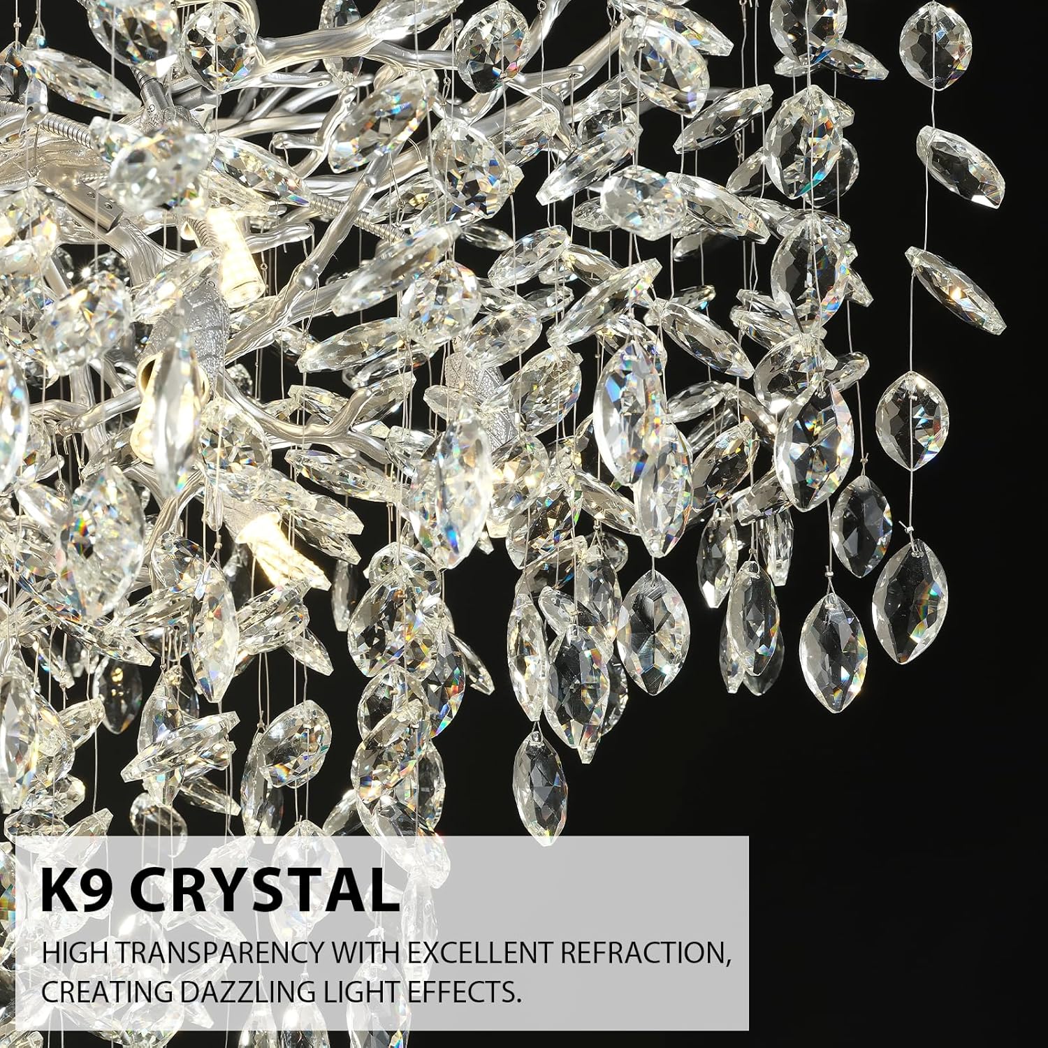 - Special Design: This high ceiling silver crystal chandeliers draws inspiration from nature, with its overall shape resembling lush tree branches. The unique design and luxurious TOP K9 crystal material of this staircase chandeliers make it a beautiful focal point in home decor.
