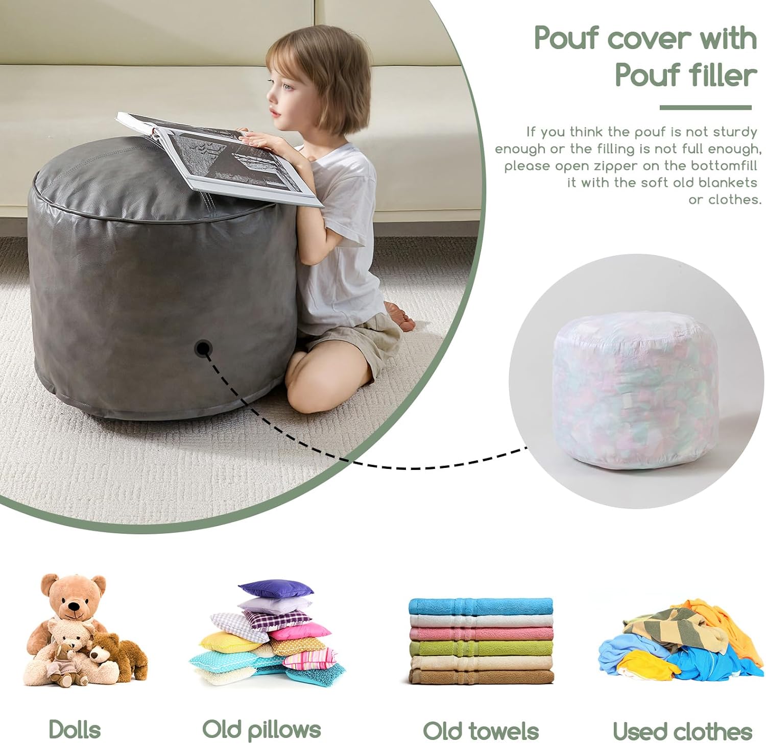 - For convenience and ease of use, this pouf ottoman comes pre-filled with memory foam chunk pouf filler, which can be easily inserted through the large round opening on the bottom with double zippers.
