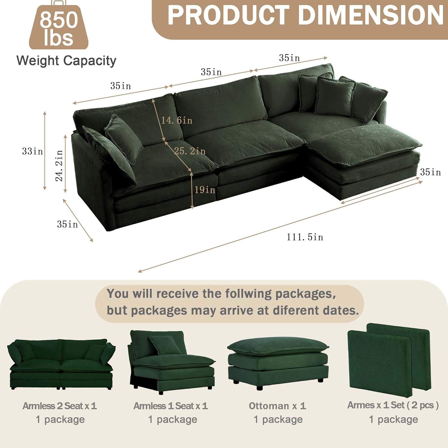 Sectional Sofa 3 Seater with Movable 1 Ottoman,Oversized Modular Couch Deep Seat (Green, 111.5 inch-L)