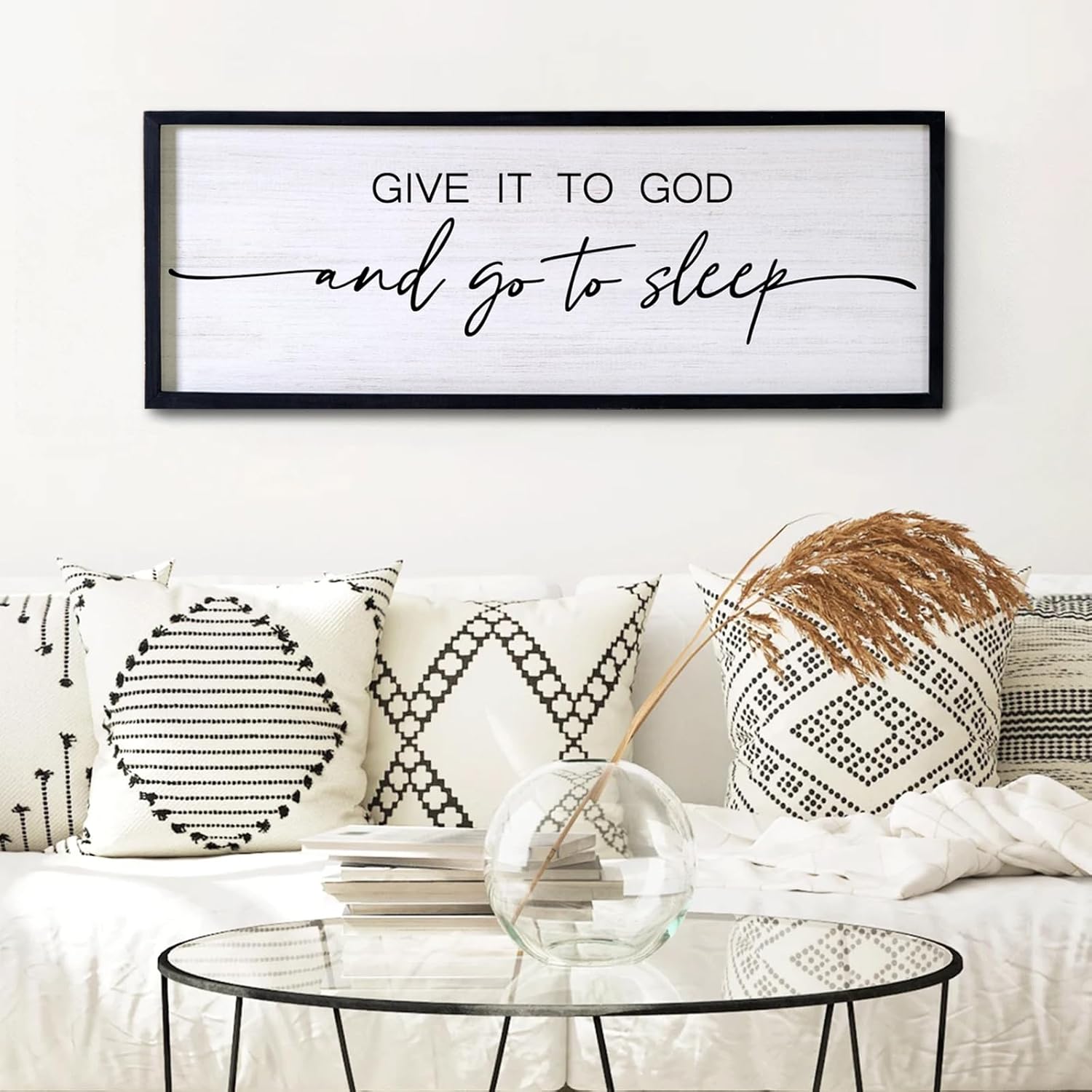 Give It to God and Go to Sleep Decorative Rustic Sign & Plaque Framed Wall Art for Couples, 40''×15'' Cottagecore Wooden Horizontal Wall Decor Above Bed, Vintage Farmhouse Wedding Gift for Bedroom