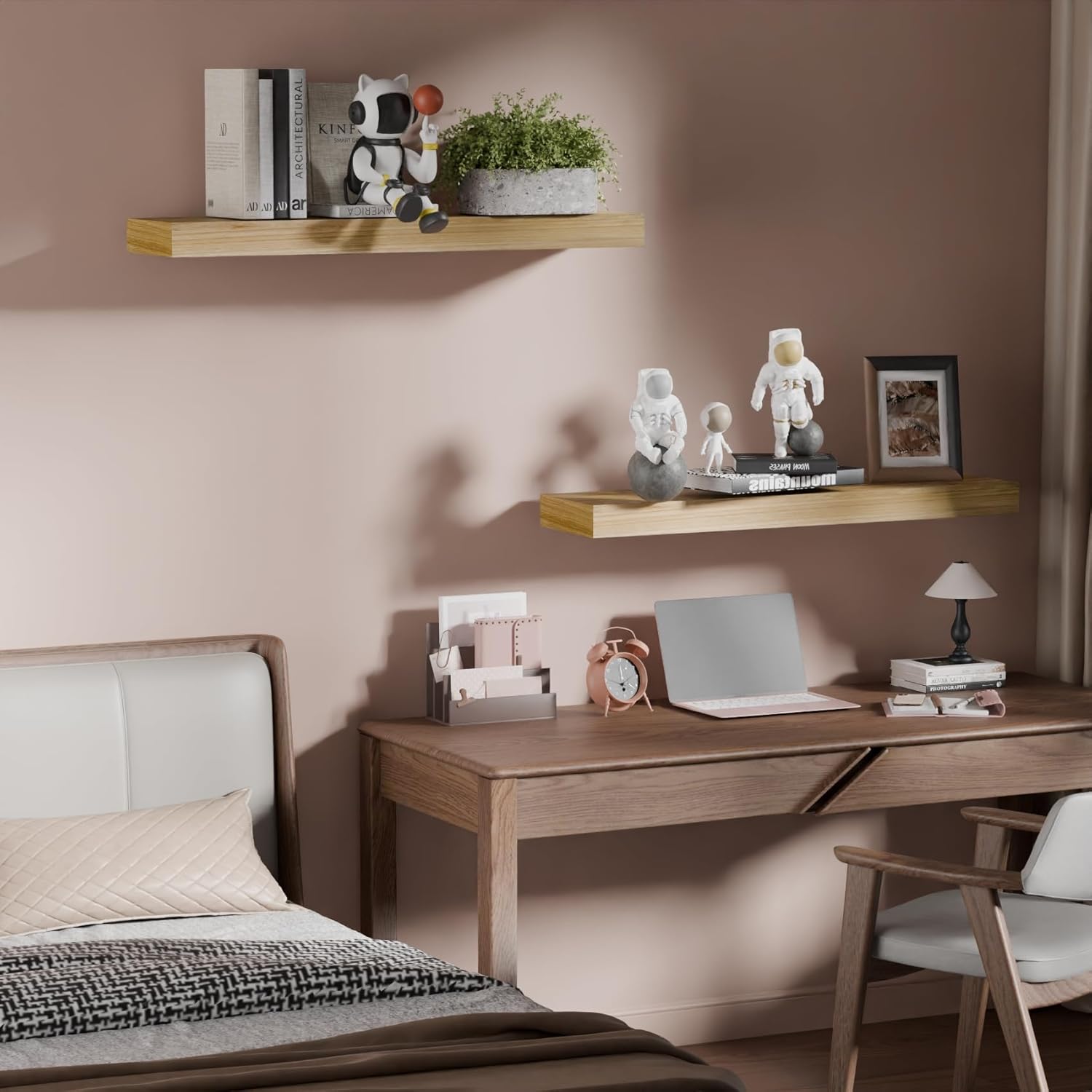 - 【𝑽𝒆𝒓𝒔𝒂𝒕𝒊𝒍𝒆 𝑼𝒔𝒆】With an even coating on all surfaces,Our floating shelves are versatile use, making them ideal for bathrooms,kitchens,bedroom.The generous 6.7" width accommodates a variety of items,from bathroom essentials to books and decorative pieces.