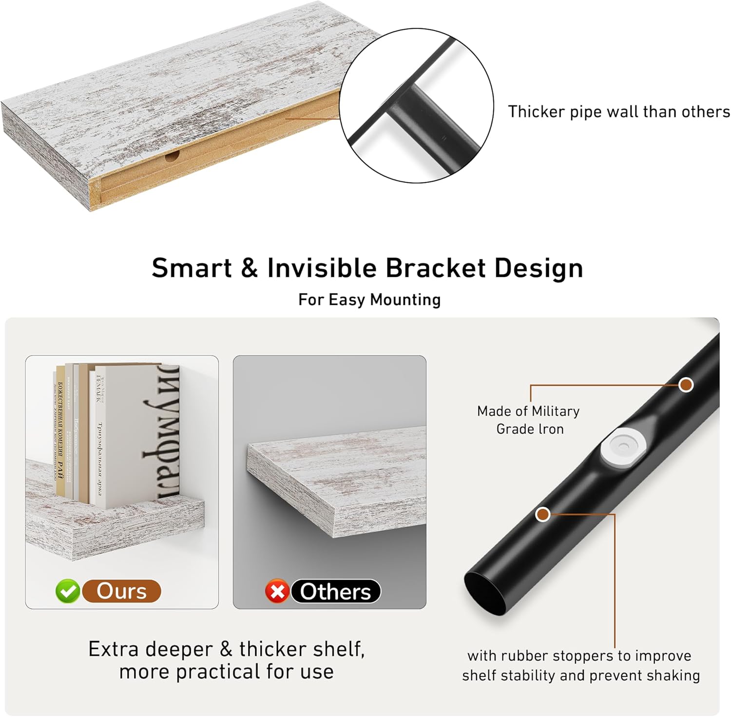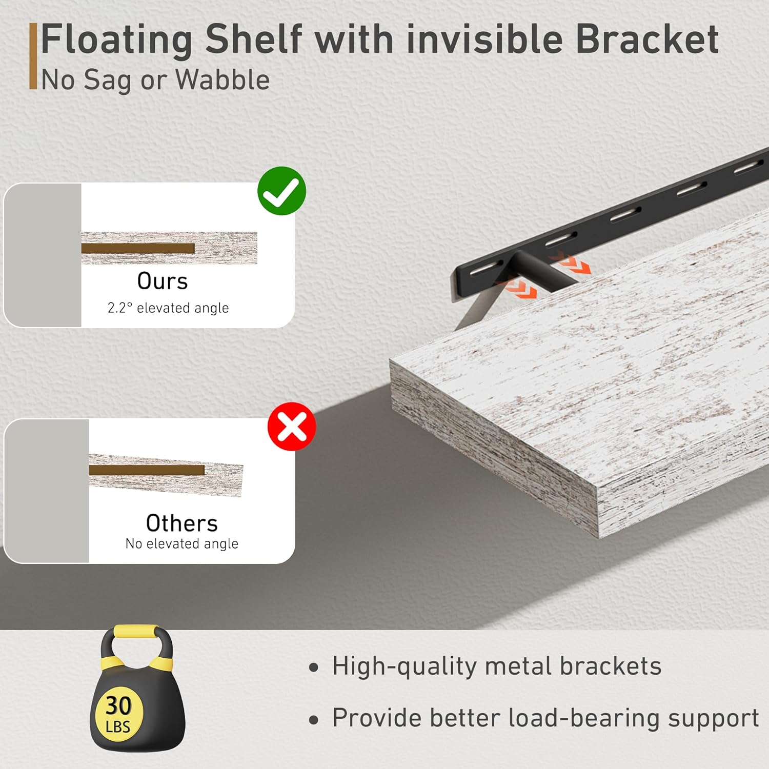 - Easy To Assemble - This floating shelves come with stainless-steel galvanized invisible brackets, toggle bolts for drywall & a simple instruction manual to help you install. The assembly of this wall shelf is very simple, only one boards and some necessary screws and other hardware, and we also have detailed instructions for you to view, you can assemble quickly. Please contact us with any questions or problems at Amazon or Fun Memories.