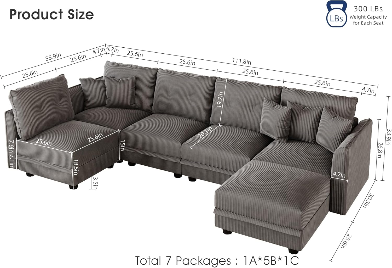 LLappuil Modular Sectional Sofa with Storage Seats, Corduroy Convertible Modular U Shaped Sectional Couch for Living Room, 6 Seat Oversized Sofa with 5 Back Cushion 5 Throw Pillow, Grey