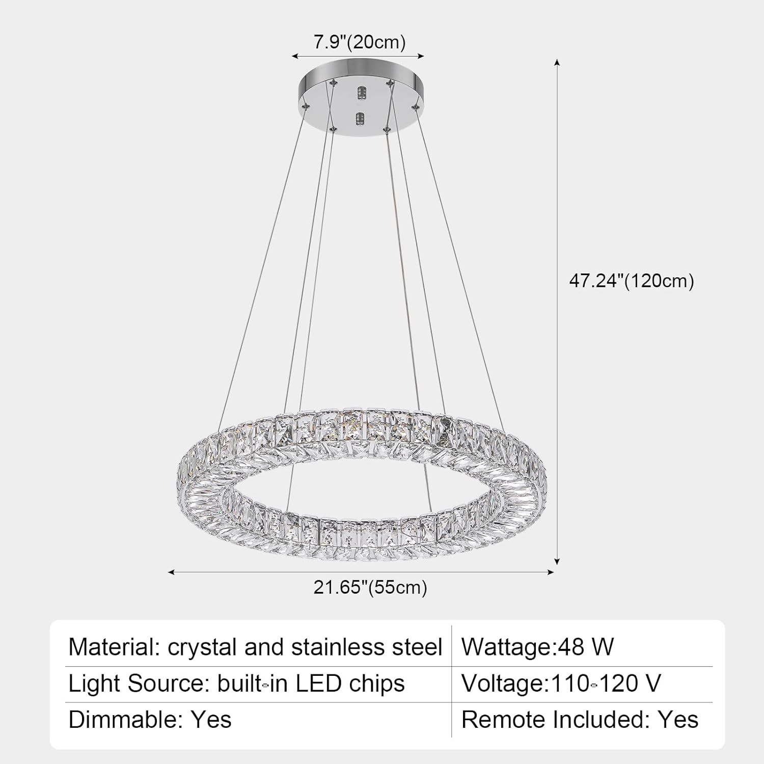 - Modern Chandelier Dimension: overall diameter 21.65 in, ceiling base diameter 7.9 in, hanging gord is adjustable from min 11.8 in to 47.2 in, light is 48 watts, 110 volts, chandelier is 100% assembled before packing, which will greatly save you time on assembly.