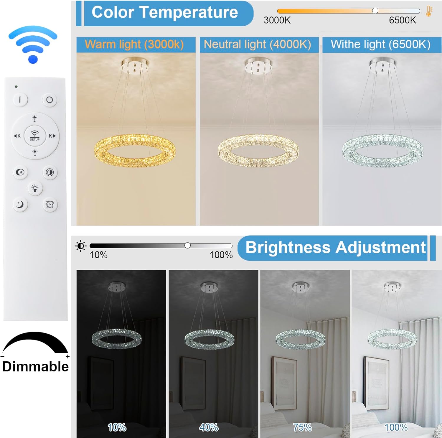 - Dimmable With Remote: 3 color temperatures adjustment( warm white 3000K, neutral white 4000K and cool white 6500K) and brightness dimming (10%-100%) by remote control to create your favorite ambiance, you can also enjoy the convenience of memory function and some other remote functions.
