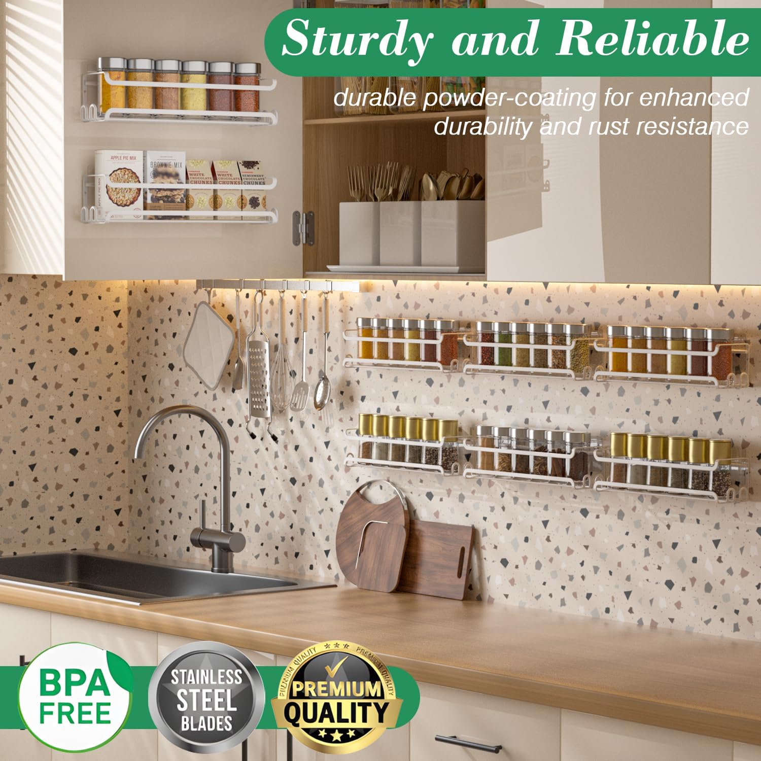 LUCYCAZ 8 Pack Wall Mounted Spice Rack with 16 Hooks, Spice Organizer Shelf for Stove Cabinet Pantry Door,Screw or Adhesive Spice Shelf Hanging Wall Spice Rack in Kitchen and RV (White, 8 PACK)