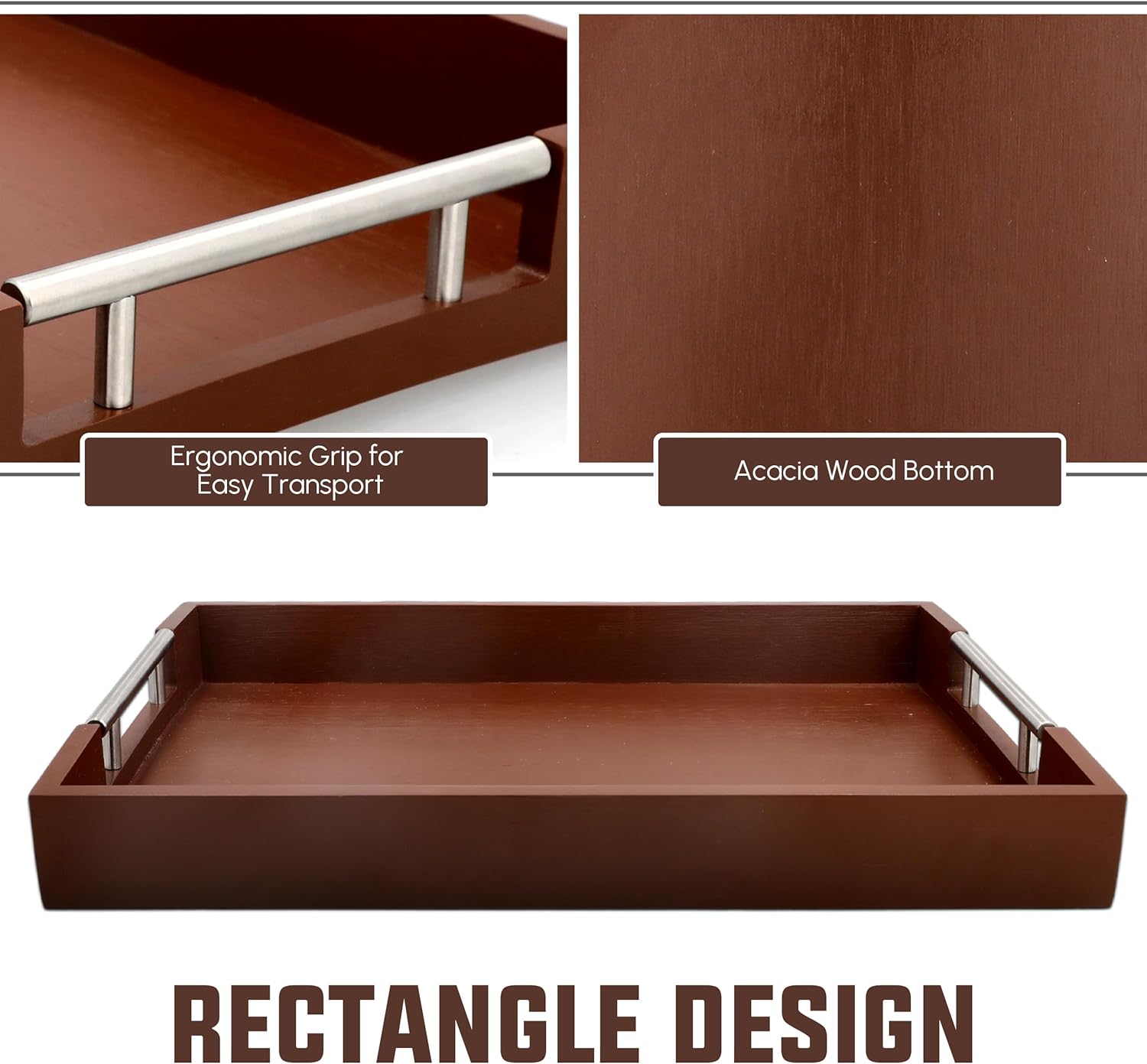 - Multi-Purpose Wooden Tray - Serve breakfast in bed, carry drinks, or create a charcuterie board with this 17x13" Acacia wood tray. Its light mahogany brown finish and sturdy handles make serving effortless and elegant.