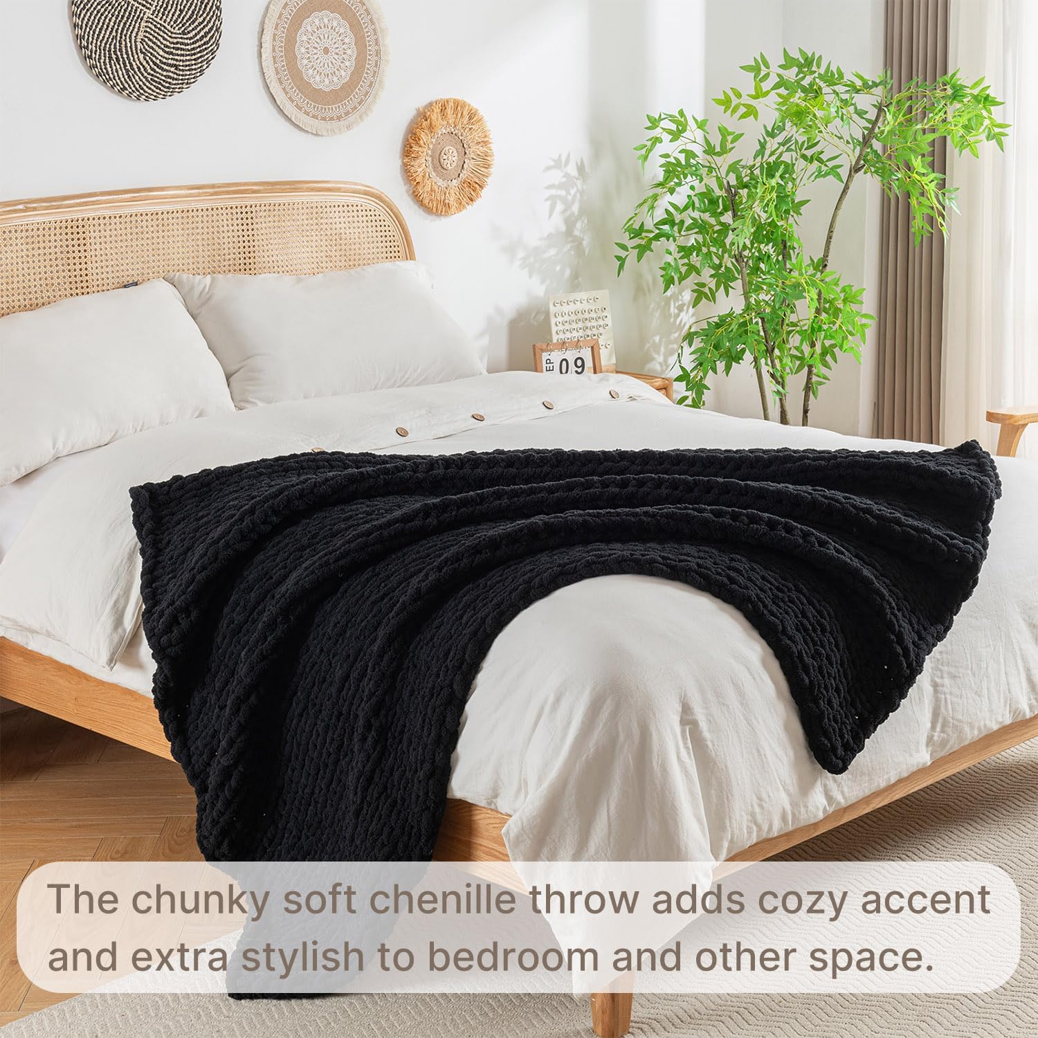 Chunky Knit Blanket Throw, 100% Hand Knit Throw Blanket Handmade Chenille Cable Knit Throw for Couch, Stylish Cozy Soft Rope Knot Crochet Blanket for Home Decor, Black, 50x60 Inches