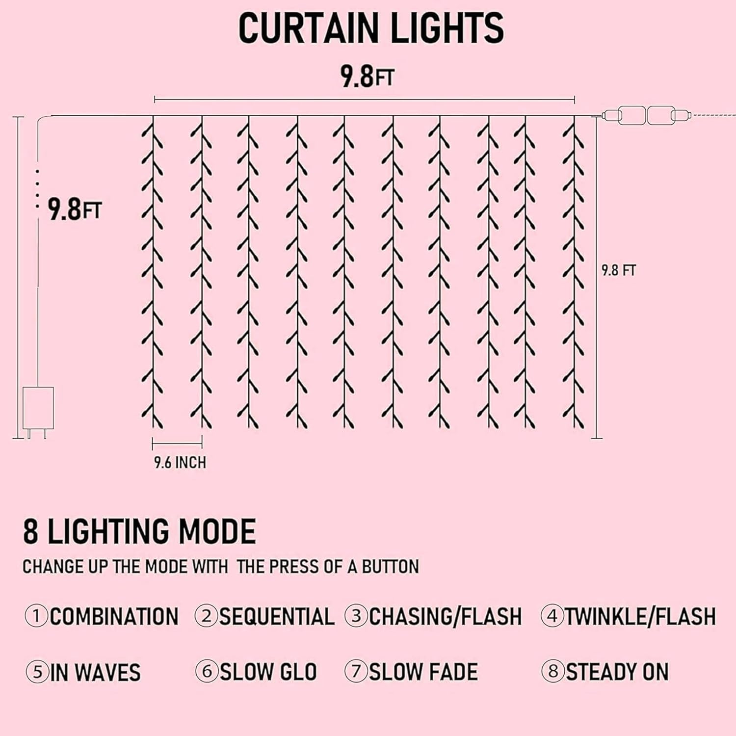 - Enchanting Pink Glow: Transform your space with a warm, inviting glow using these 300 LED curtain string lights. Measuring 9.8ft in width and 9.8ft in length, include a 9.8ft leading wire for flexible use