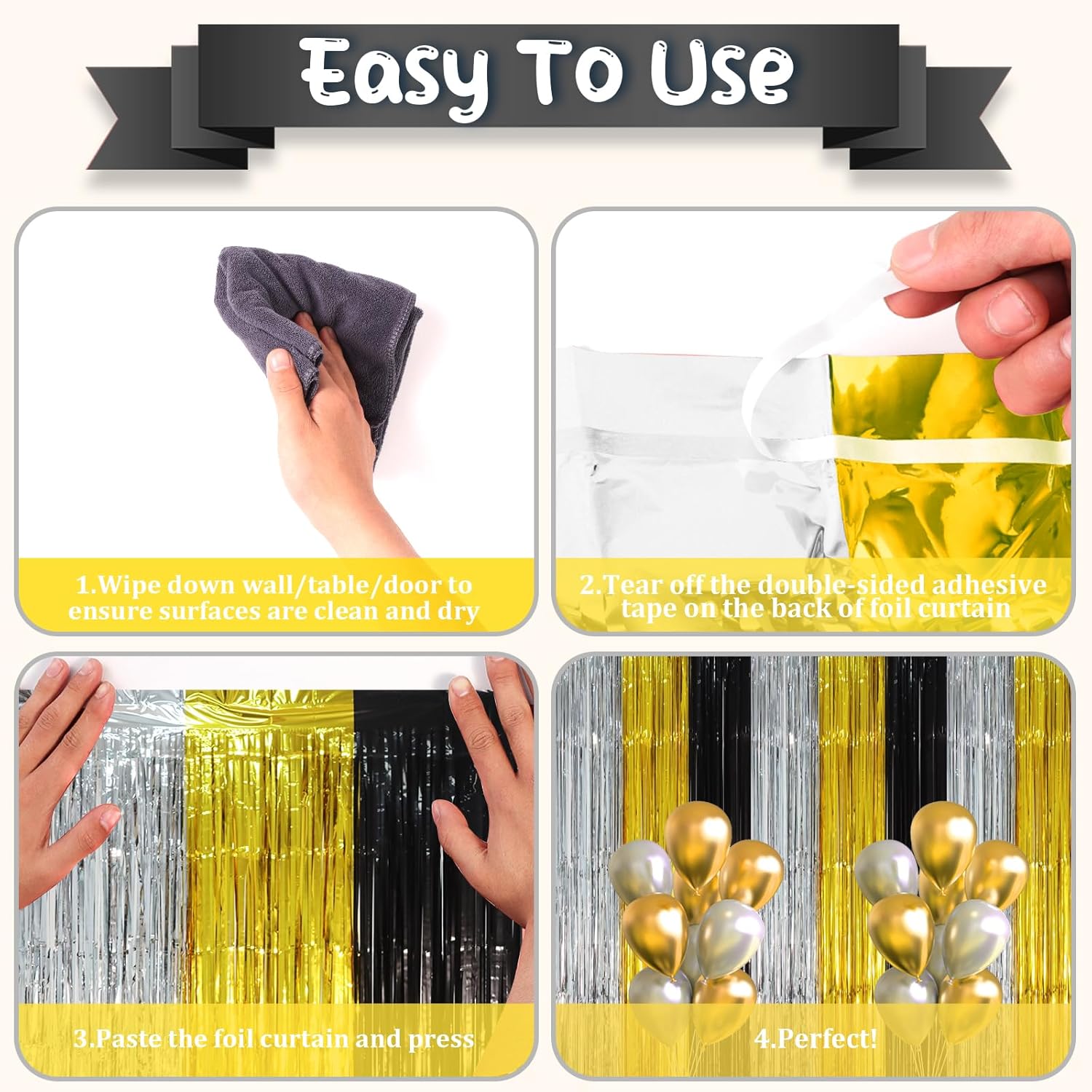 - Package Included: 3 packs of black gold and silver foil fringe curtains, the size of the foil curtain is 3.3*8.2ft. It's long enough to fit any occasion