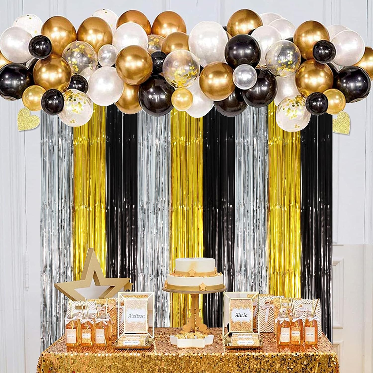 3 Pack 3.3 x 8.2 ft Black Gold Silver Foil Fringe Backdrop Curtains, Tinsel Streamers Party Decorations, Fringe Backdrop, Door Shimmer for New Years or Birthday Party
