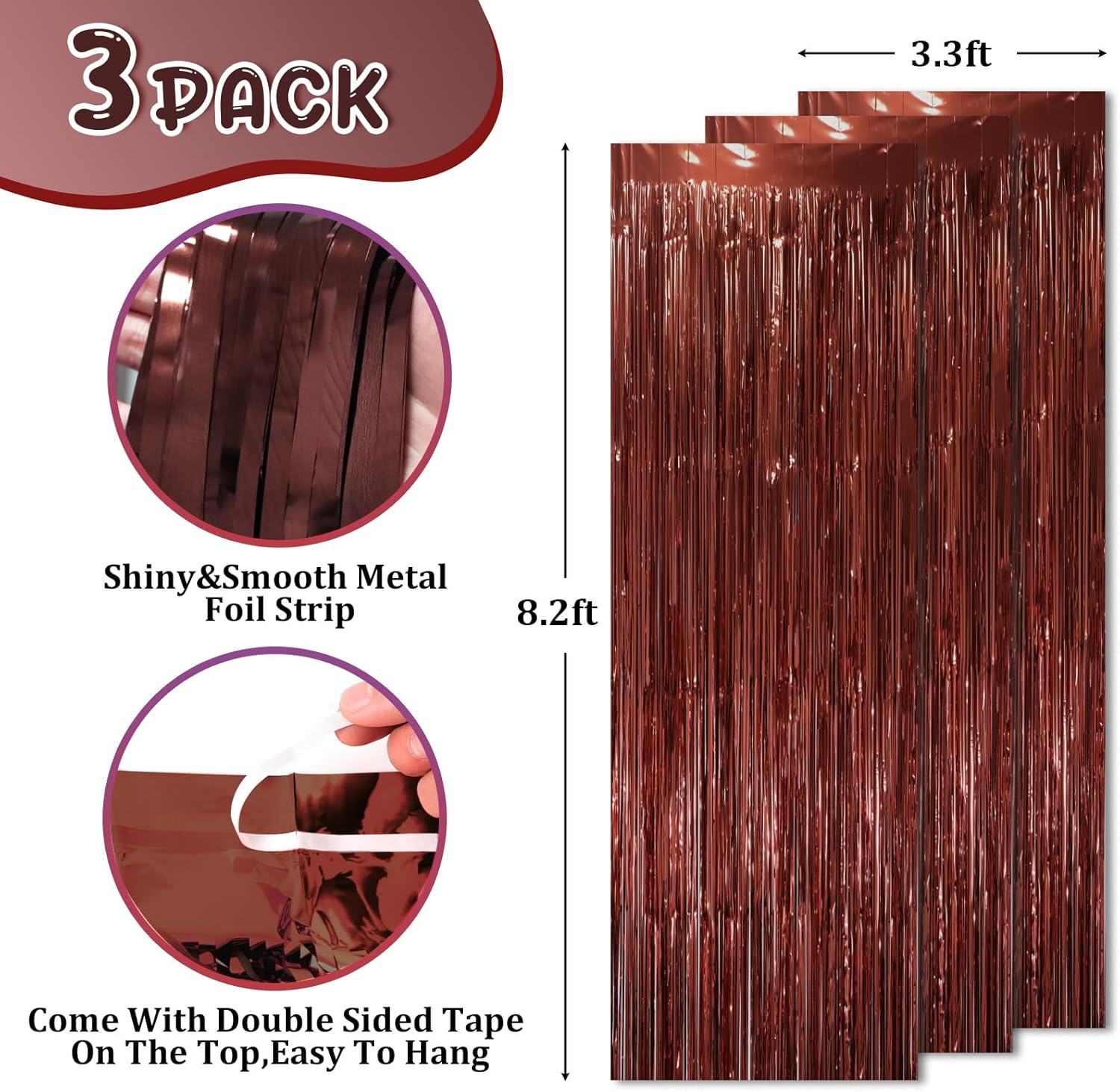 - Package Included: 3 packs of brown foil fringe curtains, the size of the foil curtain is 3.3*8.2ft. It's long enough to fit any occasion