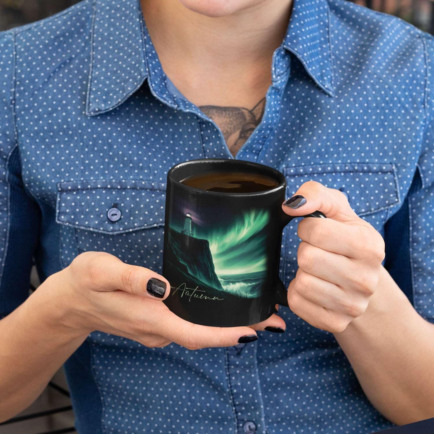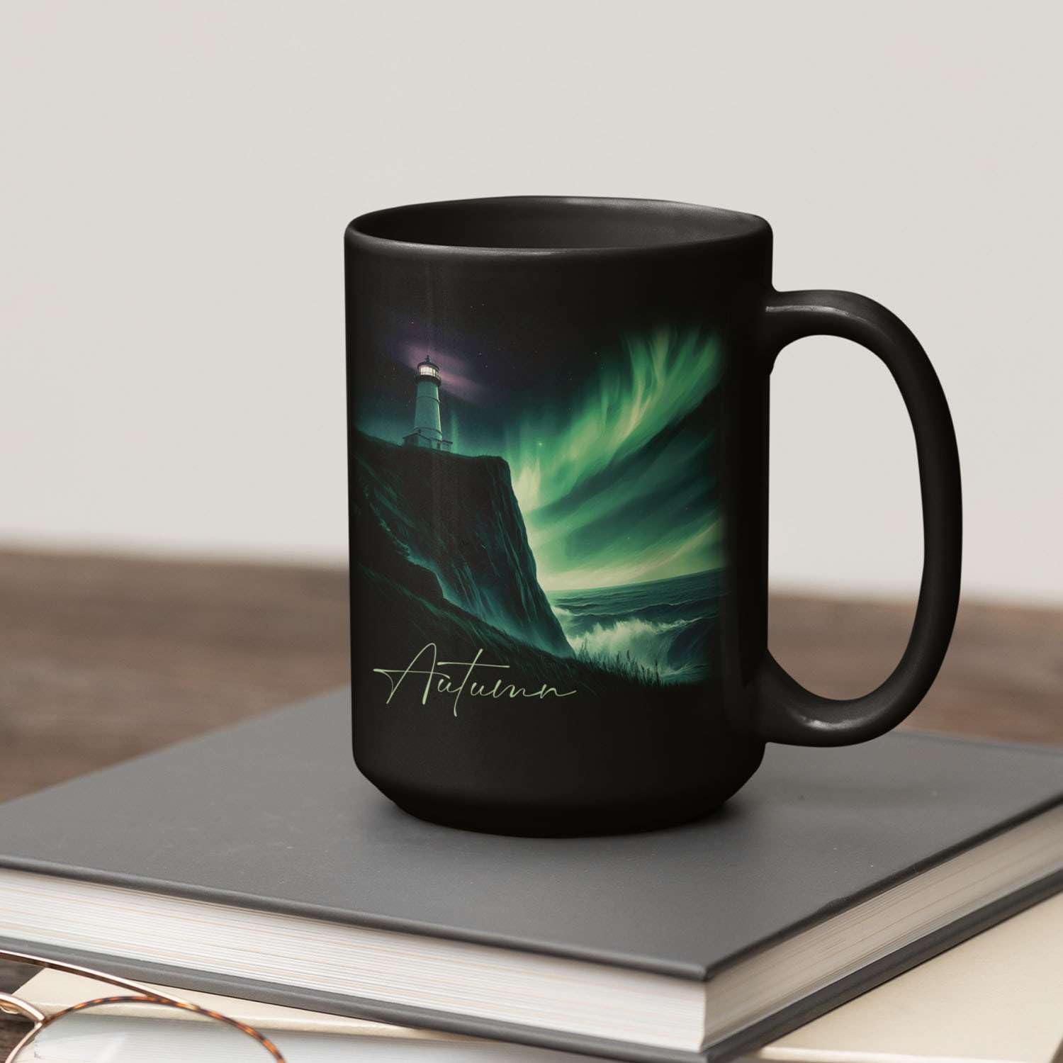 - đăUNIQUELY PERSONALIZEDăEnjoy a serene moment with this Customized Name Black Coffee Mug, featuring a stunning view of the northern lights and a lighthouse set against a mystical ocean backdrop. This personalized ceramic mug gift for nature lovers and adventurers alike. Click "Customize Now" to add a name and create a one-of-a-kind gift for both women and men.