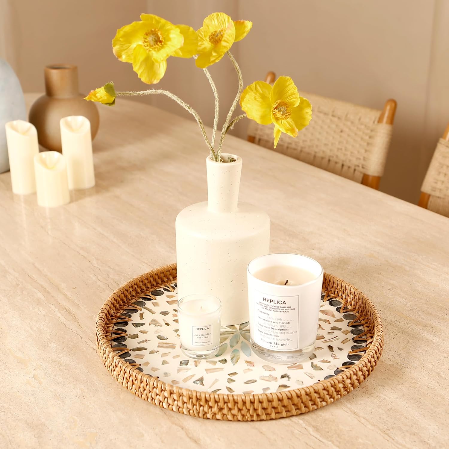 Round Rattan Tray with Mother of Pearl Inlay & Wooden Base - Decorative Wicker Serving Tray for Coffee/Bread/Fruits, Food Storage & Display - Multipurpose Home Decor (M,Fish Scales)