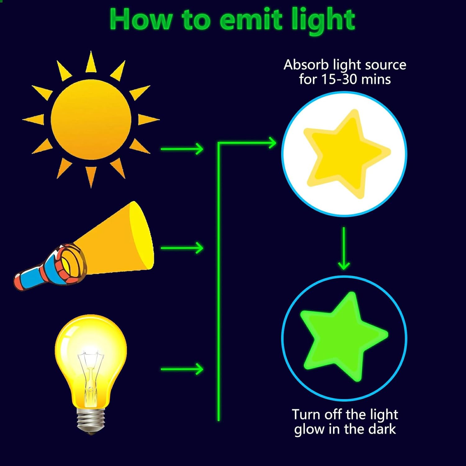 - ✦ Glow Stars Wall Decals: These glow wall decals for ceiling are made of quality luminous material,they will glow brightly when absorb enough light during the day. You just need to put it under lamplight flashlight ,room light or sunshine for 15 minutes, it will keep glowing for 8-10 hours with a gentle green fluorescent light. Please ensure the light shines on the decals without obstruction, the longer it takes to absorb light, then to light up for up to longer.