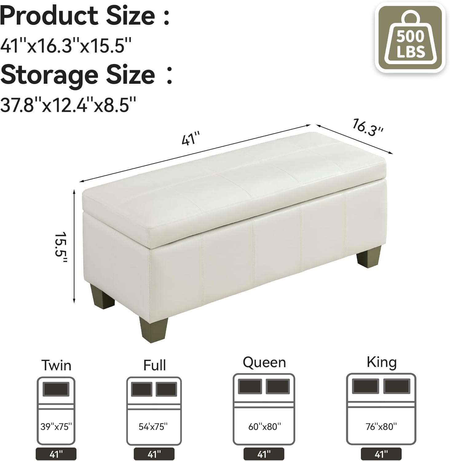 41" Faux Leather Storage Ottoman, Stitch Tufted Rectangle Upholstered End of Bed Storage Bench, Entryway Large Couch Ottoman with Wooden Legs,White