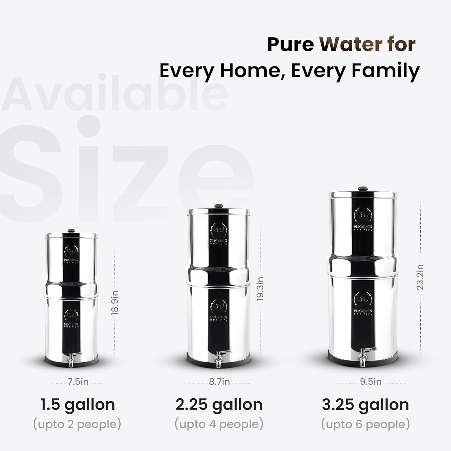 Gravity Water Filter System - 3.25 Gallons - NSF Certified - AISI 304 Stainless Steel Countertop Water Filter System with 2 Smart (Black) Carbon Filter Elements & Free Stainless Steel Water Spigot