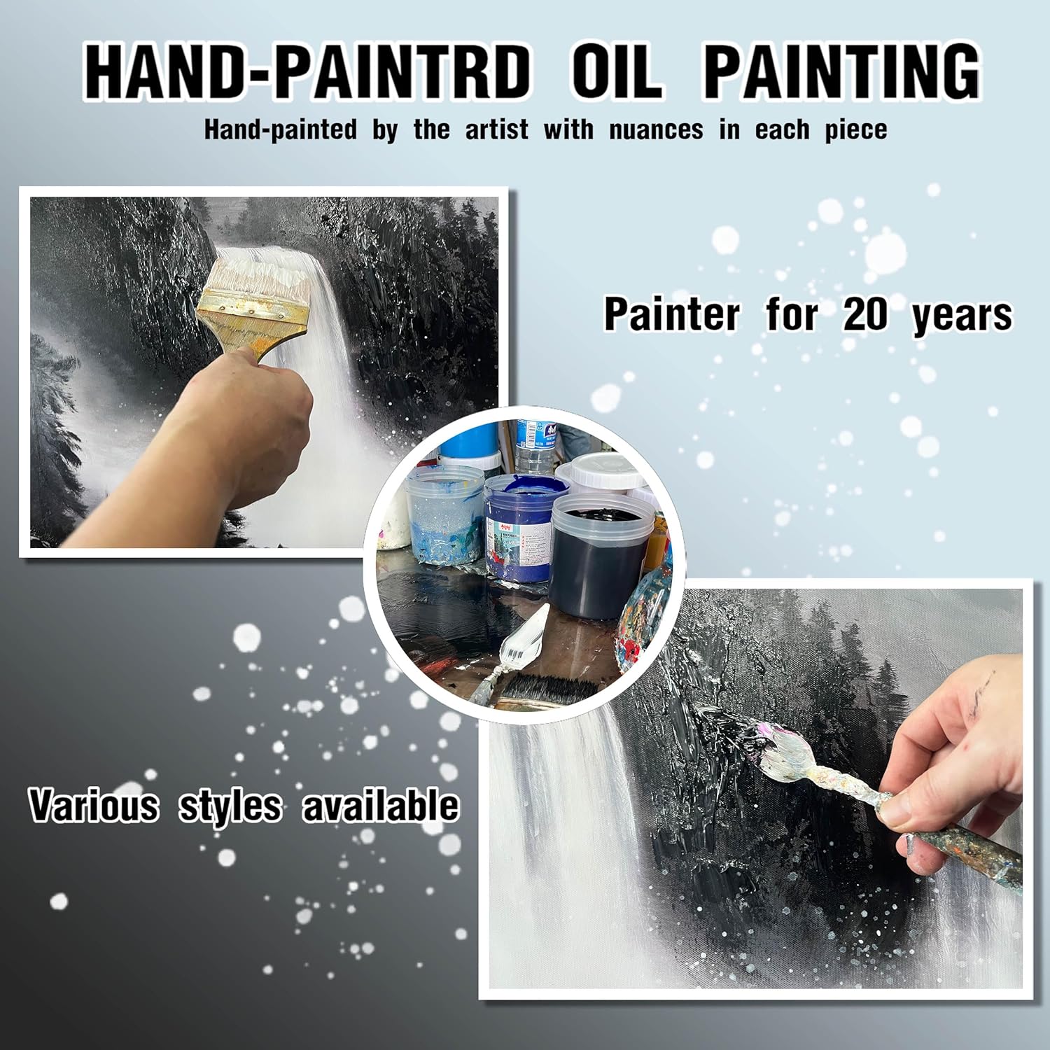 - 【Canvas Mural Size】Titled "Black and White Waterfall" The size is 60" x 30". Since each painting is hand-painted, the actual painting may differ slightly from the product image. Due to different monitor brands, the actual wall painting color may be slightly different from the product picture.