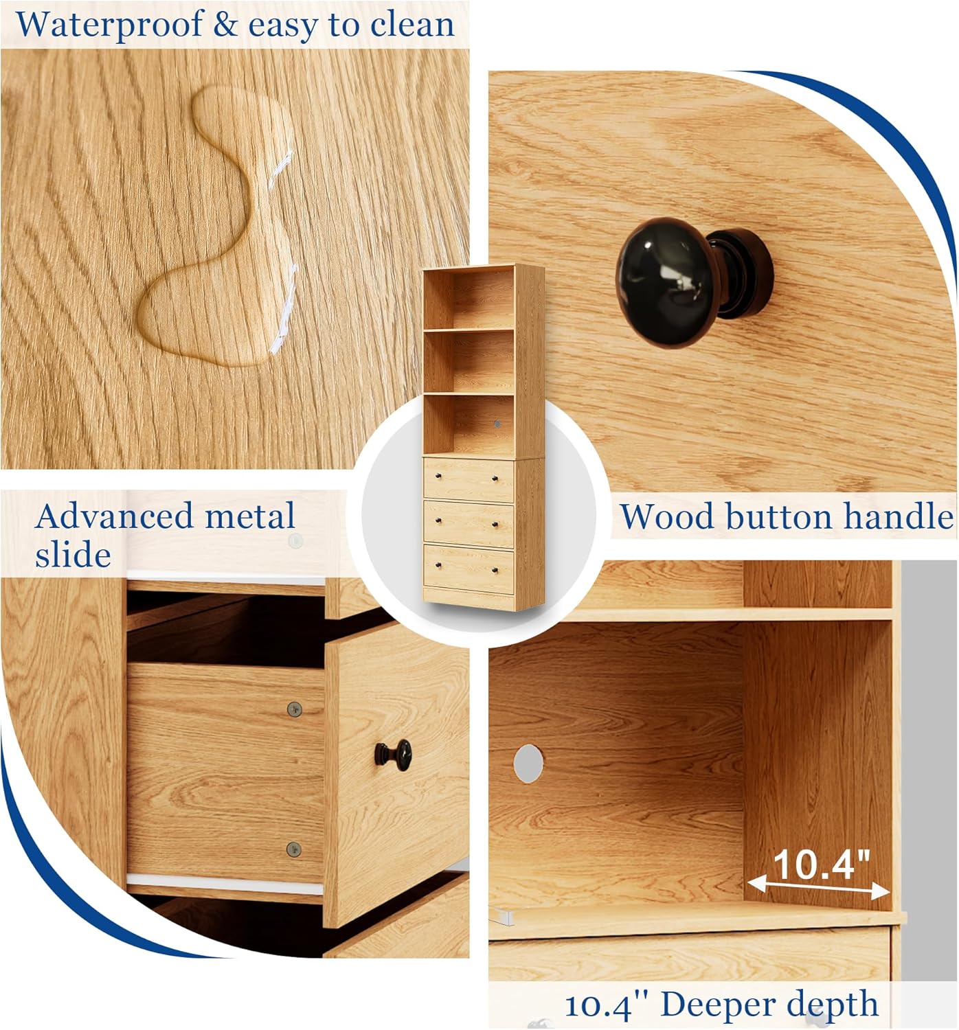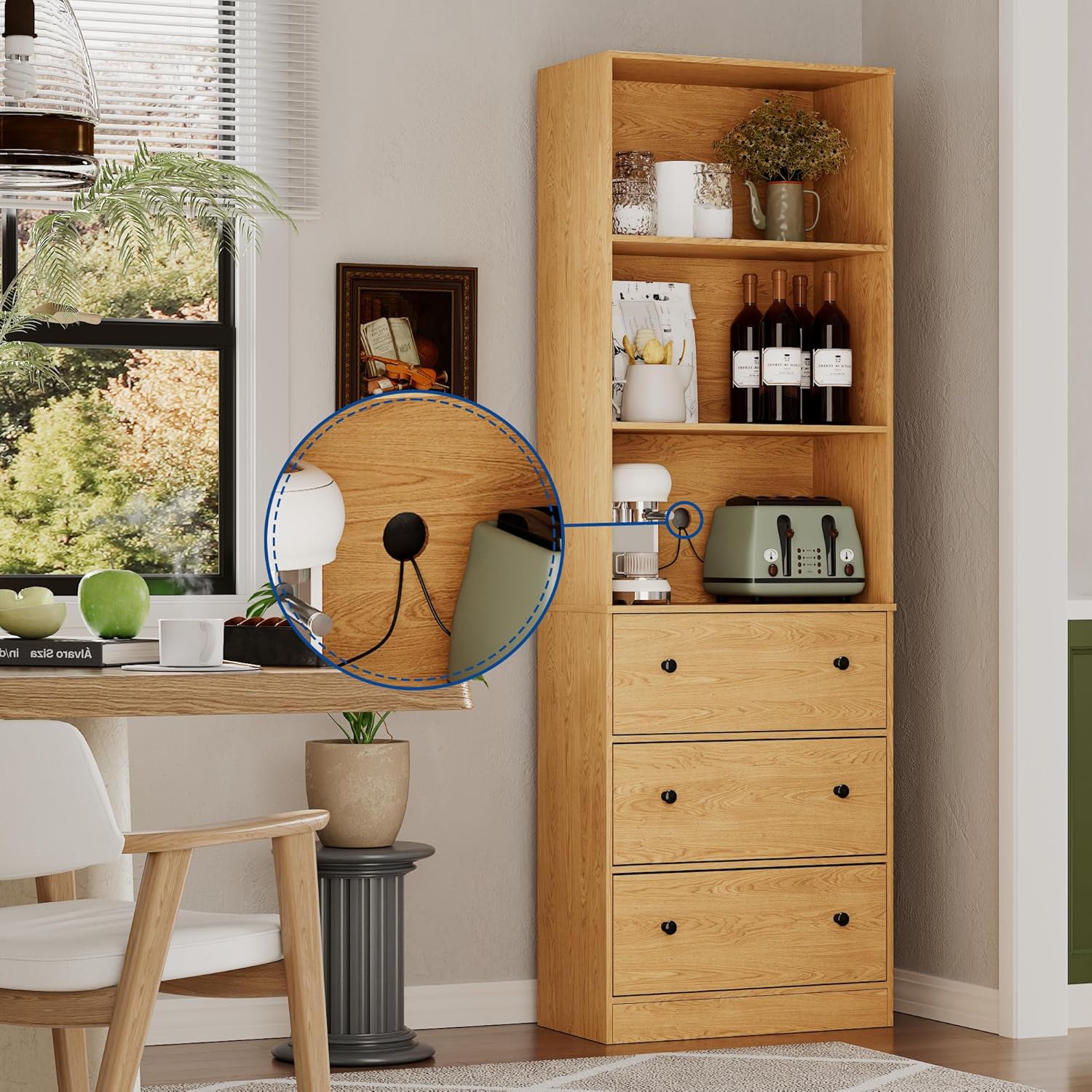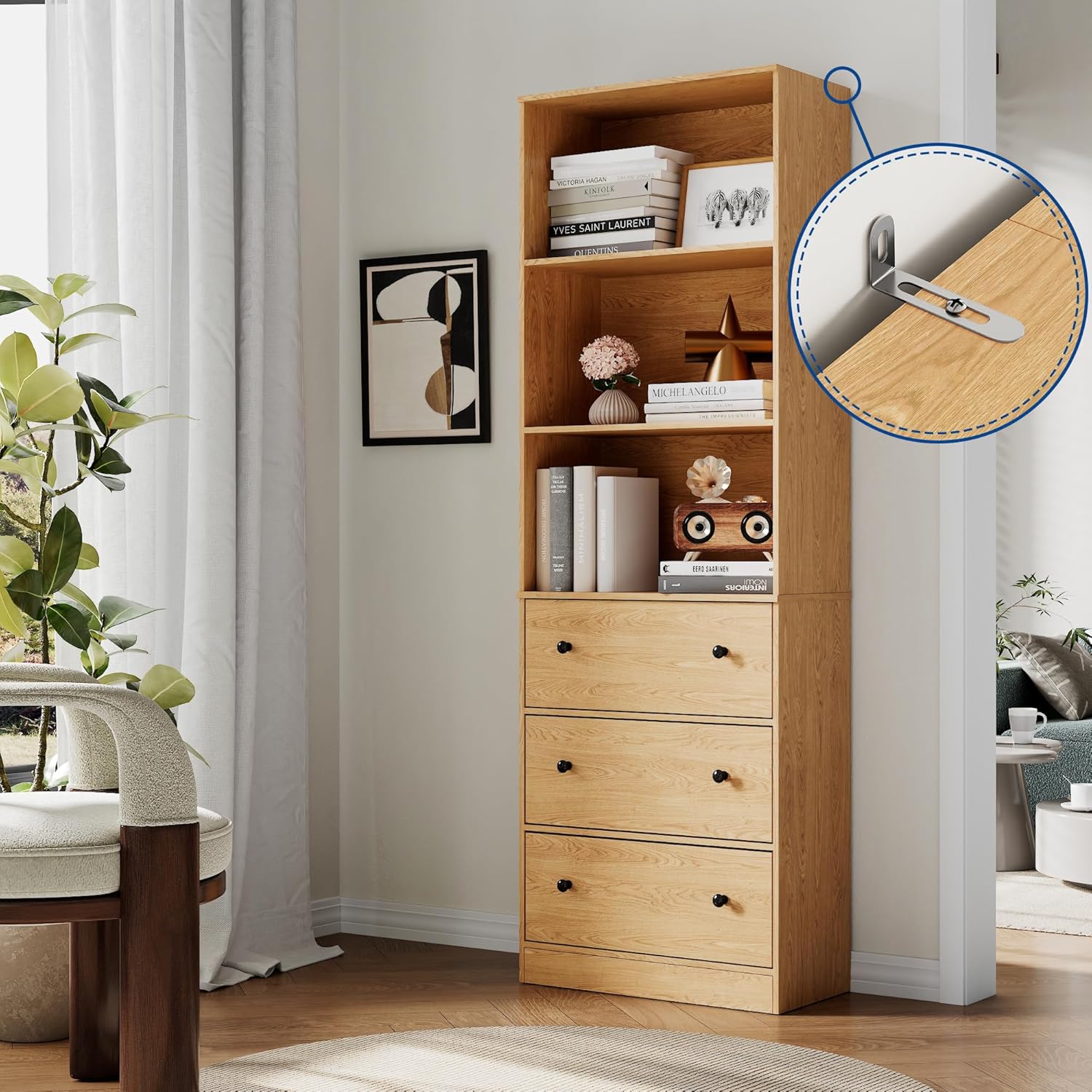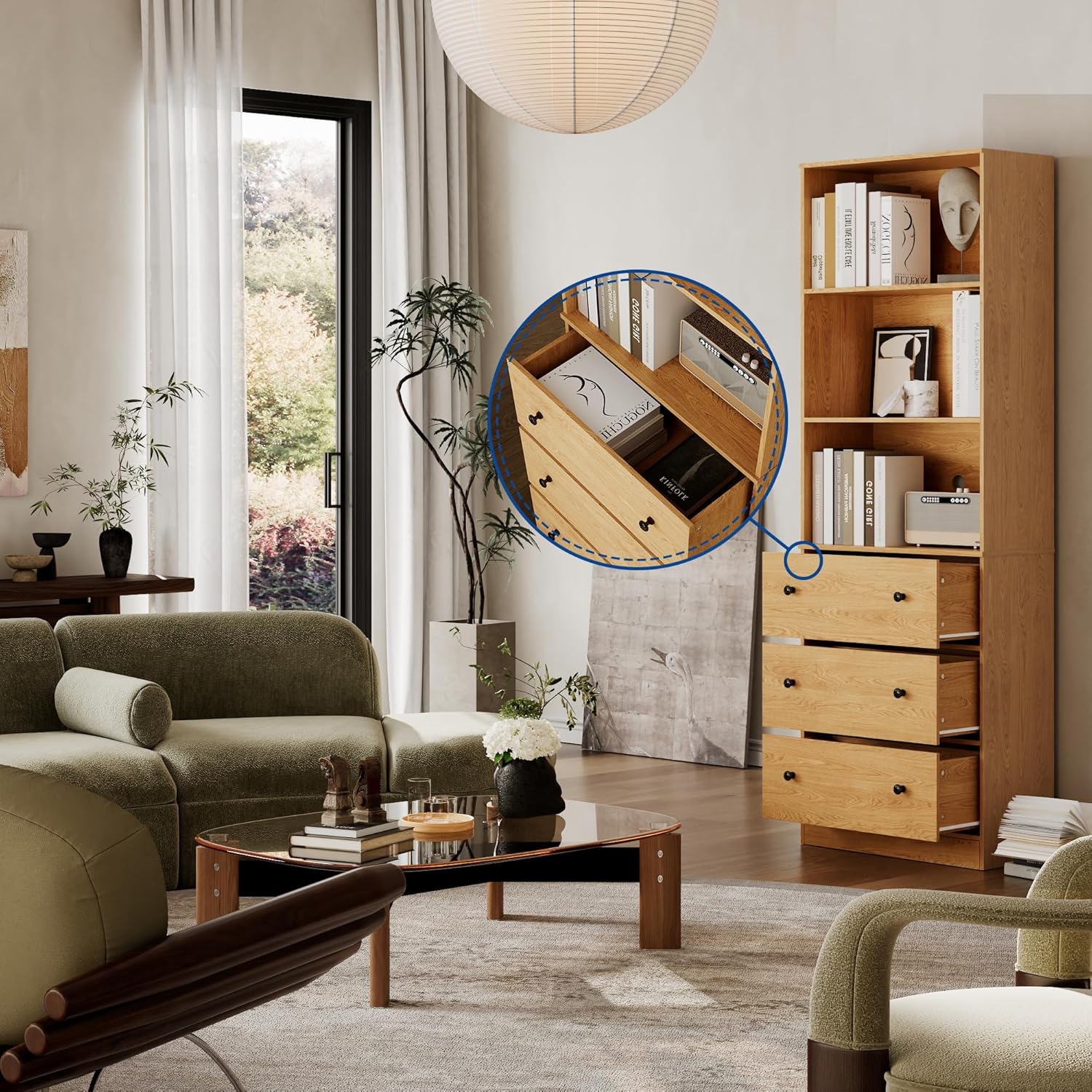 - 【71" Tall Bookcase with 3 Shelves & 3 Drawers】- This book storage shelf stands at 71" tall, providing ample vertical storage with 3 open shelves and 3 built-in drawers. Made from high-quality, waterproof, and scratch-resistant particleboard. The additional anti-tipping iron plate reinforces the tall cabinet’s stability, giving you peace of mind and preventing accidental tipping, especially in homes with children or pets.