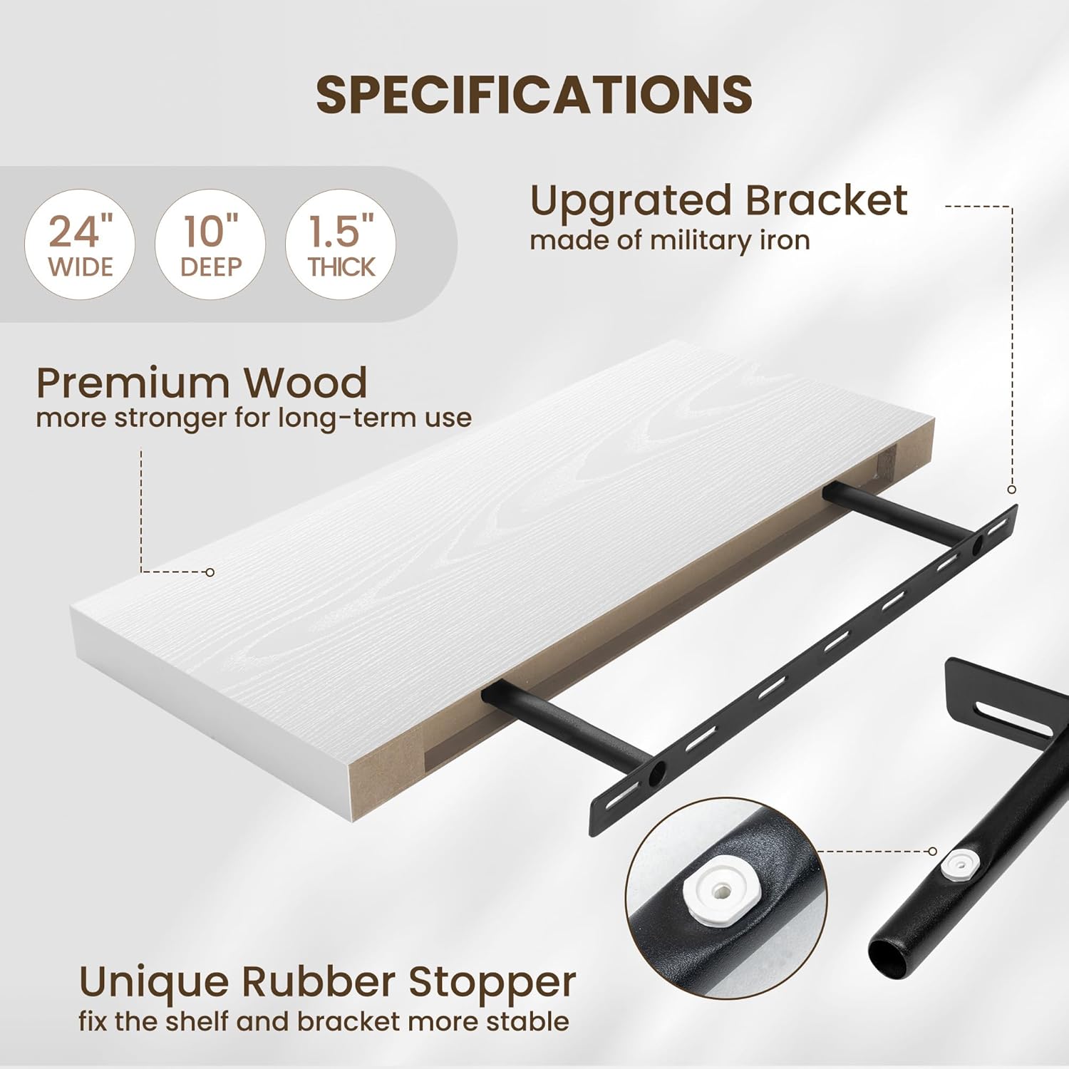 - INVISIBLE & STURDY BRACKET: This floating shelf features a simple and elegant design with an invisible bracket that creates a floating effect. The sturdy hidden support and special rubber stoppers ensure the shelf stays firmly in place, offering both strength and a clean, modern style