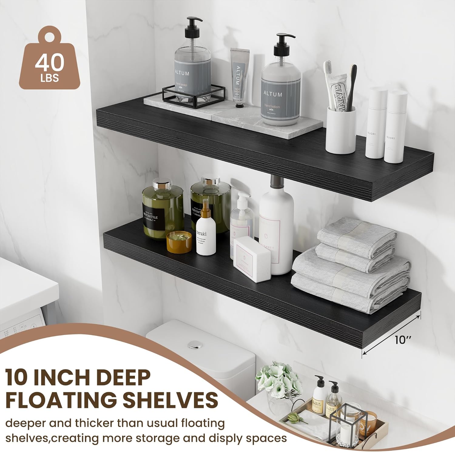 Fun Memories Floating Shelves for Wall 36 Inches, Wood Shelves with Invisible Bracket, 10" Deep Shelves Wall Mounted, Large Wood Floating Shelves for Living Room Bathroom, Black, Set of 2